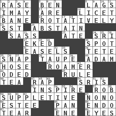 ACROSS 1. Raze (variant) 5. Benjamin's nick name 8. Straggles 12. "If ____ say so..." 13. "We ___ not amused" (Victoria) 14. It is permitted: Lat. 15. Object of repulsion 16. Happening in regular succession 19. Fast jet (abbr.) 20. Choose not to consume 21. Backtalk 23. Had dinner 24. _ Lanka 27. Supplemented with great effort 30. Blemish 31. Artist's stands 34. False hair 35. Fastener 38. Grayish beige 40. First of billions? 41. Flexible conduit 42. Nomad 44. Wrote a lyric poem 45. Governing power 46. Beverage made from leaves 47. Reproach for some lapse or misdeed 50. Indian titles of respect 53. Stimulate to action 57. Director Reiner 59. Supplementary 63. Words to Nanette 64. First name in cosmetics 65. Baking dish 66. Inside; within (prefix) 67. Lacerate 68. Compass dir. 69. Snake ____ (dice throw) DOWN 1. Chest bones 2. Collect or gather 3. Before Barbara or Clara 4. Sight organ 5. Sharp remark 6. Greek god of love 7. Remaining after all deductions 8. 54 in ancient Rome 9. Adept person 10. Set 11. Filthy place 14. Actor's bit 17. Auto club (abbr.) 18. Teat (slang) 20. "____ silly question..." 22. Oozed 24. Moved rapidly 25. Roll call or roster of names 26. A distinct part 28. Eastern Standard Time (abbr.) 29. Letter starter 30. A viewer who gazes fixedly 32. Nilotic language 33. Coast Guard woman 35. Guess 36. Connecting point 37. Toward the sea 39. Australian flightless bird 43. Otherwise 47. Cause heat under the collar 48. A saturated hydrocarbon 49. Pacific Standard Time (abbr.) 51. Literary sarcasm 52. Something which is sent 54. Corncob 55. _ the terrible 56. French philosopher Descartes 58. Scornful sounds 59. Arrange properly for use 60. Purpose 61. Parent Teacher Association (abbr.) 62. For each 63. Born