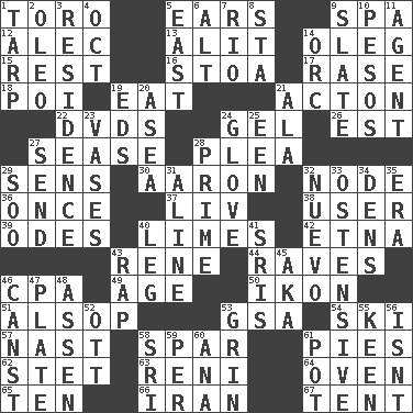 ACROSS 1. "Corrida" creature 5. Hearing organs 9. Health resort 12. Actor Baldwin 13. Set down 14. Cassini of fashion 15. Remainder 16. Portico 17. To erase 18. Luau course 19. Consume 21. Gambison 22. Movie discs 24. Set 26. Eastern Standard Time (abbr.) 27. Gospel singer Marvin 28. Entreaty 29. Elected reps. 30. Composer Copland 32. Connecting point 36. Single time 37. 54 in ancient Rome 38. One who uses or employs something 39. Lyric poems 40. Citrus fruits 42. Inactive volcano in Sicily 43. French philosopher Descartes 44. All-night dance parties 46. Accounting whiz (abbr.) 49. Grow older 50. Image 51. Columnist Joseph or Stewart 53. Girls' org. (abbr.) 54. What Jean-Claude Killy likes to do 57. Political cartoonist Thomas 58. Coast Guard woman 61. Sliced desserts 62. Proofreading order 63. Painter Guido (1575-1642) 64. Baking chamber 65. Nine, plus one 66. SW Asia republic 67. Portable shelter DOWN 1. Canvas cover 2. Butter sub 3. Home 4. Sep. follower 5. 90 degrees 6. The first octave above the treble staff 7. River (Sp.) 8. R.R. building 9. Chalkboard 10. Mexican monetary units 11. Representative 14. The grampus (Milton) 19. Begley and Asner 20. At sea 21. In the manner of 23. Flower holders 24. Michael Jackson trademark 25. Car or cant ending 27. Post 28. First class 29. "Barney Miller" actor Jack 31. Place in a line 32. New (sp.) 33. Clearly or manifestly demonstrative 34. Habitations of wild animals 35. Epoch 40. Part of a journey 41. Indian titles of respect 43. Strike 45. Alias (abbr.) 46. 2nd pers. sing. pres. of can (arch.) 47. Food holder 48. NE Netherlands city 52. Baseball player Mel 53. Amused look 55. Peachy ____! 56. Is not 58. Indian title of respect (Mr.) 59. For each 60. Santa ___, CA 61. Plant holder