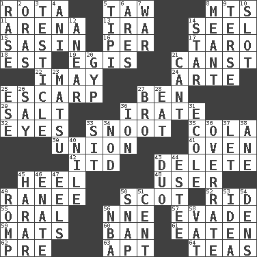 ACROSS 1. Roll call or roster of names 5. The 23rd letter of the Hebrew alphabet 8. Mountains (abbr.) 11. Sports stadium 13. Lyricist Gershwin 14. Sew up the eyelids of hawks and falcons 15. Indian antelope 16. For each 17. Edible starchy tuberous root 18. Eastern Standard Time (abbr.) 19. The front part of a cuirass 21. 2nd pers. sing. pres. of can (arch.) 22. "If ____ say so..." 24. Johnson of "Laugh-In" 25. Fortification 27. Benjamin's nick name 29. Table seasoning 30. Feeling or showing extreme anger 32. Snake ____ (dice throw) 33. Snout, nose 35. Root beer relative 39. The state of being joined or united 41. Baking chamber 42. It would 43. Keyboard key 45. The bottom of a shoe or boot 48. One who makes use of a thing 49. Indian princess (variant) 50. Highlander 52. To free from 55. Relating to the mouth 56. Compass dir. 57. Dodge 59. Floor protectors 60. Prohibit 61. Eroded 62. Before (prefix) 63. Fitting 64. Afternoon social gatherings DOWN 1. To erase 2. Mouths or openings 3. One of the two male reproductive glands 4. Cuckoo 5. Native american tent (variation) 6. Ancient Greek god of war 7. Armed conflict 8. Intended 9. Laconic 10. Narrow, elongated depression 12. Approach 14. Play the lead 20. Flimflam 21. Patter 23. Taiwanese island in East China Sea 25. Compass dir. 26. Declare 27. Sis' sibling 28. Ingest 30. Electrically charged atom 31. Learning spot: Fr. 33. Be seated 34. Lower and raise head in agreement 36. Make much ado about nothing 37. Allow 38. One (Scot) 40. The longest river in the world 43. Superhero pair 44. First name in cosmetics 45. Ethiopian city, capital of Harari 46. Related on the mother's side 47. Snakelike fish 49. Frolic 50. Fastener 51. Penny 53. The content of cognition 54. Cub Scout units 56. Basketball assoc. 58. Large container
