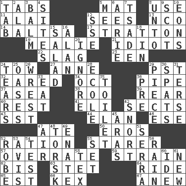 ACROSS 1. Bar bills 5. Floor covering 8. Purpose 11. Jai ____ 12. Observes 13. Non-commissioned officer (abbr.) 14. Greek mezzo-soprano Agnes 17. Ski resort town in Vermont 19. Ear of corn 21. Foolish or stupid persons 22. Volcanic refuse 23. Car or cant ending 24. Pull behind 27. Queen of England 1702-14 29. Pacific Standard Time (abbr.) 32. Having ears or earlike features 34. Sep. follower 36. Corncob 37. At sea 38. Friend of Pooh 39. Tail end 40. Remainder 41. Connecticut Ivy Leaguer 42. Religious groups 43. Fast jet (abbr.) 44. Liveliness 46. Compass dir. 47. Had dinner 50. Greek god of love 52. Food allowance for one day 55. A viewer who gazes fixedly 57. Make much ado about nothing 59. Put through a sieve 62. Again 63. Proofreading order 64. Travel on or in a vehicle 65. Eastern Standard Time (abbr.) 66. Dry husk or covering 67. Afresh DOWN 1. Keyboard key 2. According to 3. Lip ointment 4. Locates 5. Was introduced to 6. Nest on high 7. Sadhe (variant) 8. To (old English) 9. Highlander 10. Immeasurably long periods of time 12. Compass dir. 15. Vegetable dish 16. ____ Jay Lerner 18. Shallow baking pan 20. Disregard 24. Rends 25. Fertile tracts in a desert 26. Take or capture by force 28. Learning spot: Fr. 29. Part 30. Arguments over trivial matters 31. Laconic 33. Ingest 35. Bathroom plumbing fixture 36. Before (prefix) 42. Derisive sound 45. Caspian sea tributary 47. Wind 48. Cod relative 49. Related on the mother's side 51. Spanish missionary in California 52. Loose flowing garment 53. Deliberation 54. Trial 55. Arrange properly for use 56. Water falling in drops from the sky 58. John Ritter's dad 60. Binary compound 61. ___ Haven, CT