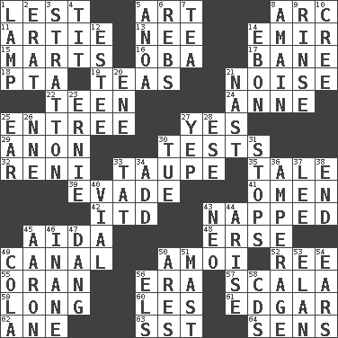 ACROSS 1. For fear that 5. Tate display 8. Curve 11. Nick name for Arthur 13. Born 14. Arab leader 15. Shops 16. Chief or king in Benin or Nigeria 17. Object of repulsion 18. Parent Teacher Assoc. 19. Beverages made from leaves 21. Annoying sound 22. Adolescent 24. Queen of England 1702-14 25. Main course 27. Affirmative reply 29. Soon (poet.) 30. Trials 32. Painter Guido (1575-1642) 33. Grayish beige 35. Story 39. Elude 41. Sign of something about to happen 42. It would 43. Slept 45. Opera by Verdi 48. Celtic language 49. Lessep's creation 50. Mine, in Marseilles 52. Portuguese money of account (variant) 55. Northwest Algerian city 56. Epoch 57. Any of the three canals of the cochlea 59. Having great length 60. French article 61. _ Allan Poe 62. A saturated hydrocarbon 63. Fast jet (abbr.) 64. Elected reps. DOWN 1. Desk light 2. Part of Q.E.F. 3. Ski resort town in Vermont 4. Teat (slang) 5. Small Philippine buffalo 6. Confederate soldiers (slang) 7. Beverage made from leaves 8. At full speed 9. Wash lightly 10. Algonquian 12. First name in cosmetics 14. Inky black, to poets 20. Compass dir. 21. Political cartoonist Thomas 23. Bert's buddy 25. Ewer handle 26. Compass dir. 27. Slangy assent 28. Compass dir. 30. Third day of the wk. 31. Constricts 33. Make lace 34. Increase 36. Electrical Measurement 37. Area sheltered from the wind 38. Conclude 40. Small bottle 43. Modern: prefix 44. Originate 45. Composer Copland 46. Lacking in sense or substance 47. Mild oath, euphamism for damn 49. Root beer relative 50. Ancient Greek god of war 51. Vertical spar for supporting sails 53. Flair 54. Hearing organs 56. Raised railways 58. Music discs