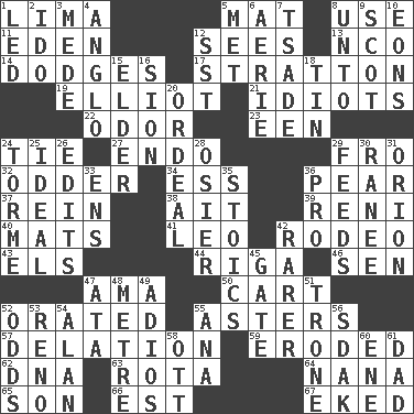 ACROSS 1. Pale green bean 5. Floor protector 8. Purpose 11. Locale of original sin 12. Observes 13. Non-commissioned officer (abbr.) 14. Evades 17. Ski resort town in Vermont 19. American author Paul (1891-1958) 21. Foolish or stupid persons 22. Scent 23. Car or cant ending 24. Standoff 27. Inside; within (prefix) 29. Back 32. More peculiar 34. Double-curved letter 36. Lightbulb-shaped fruit 37. It's straight from the horse's mouth 38. Small island 39. Painter Guido (1575-1642) 40. Floor coverings 41. Lion 42. Cowboy competition 43. Raised railways 44. Port city in Latvia 46. Elected rep. 47. Nanny (var.) 50. Haul 52. Declaimed 55. Michaelmas daisies 57. Conveyance 59. Eaten away 62. Heredity factor (abbr.) 63. Round or rotation of duties 64. Grandmother 65. Male offspring 66. Eastern Standard Time (abbr.) 67. Supplemented with great effort DOWN 1. Directed 2. Wedding promise 3. Ancient Persian 4. White American of non-Hispanic descent 5. Was introduced to 6. Nest on high 7. Sadhe (variant) 8. To (old English) 9. Highlander 10. Immeasurably long periods of time 12. Fast jet (abbr.) 15. A person who is older than you are 16. The Jewish people; Israel 18. Shallow baking pan 20. Severe or trying experience 24. Singer Mel 25. Perfect 26. Prepares for publication 28. Flexible twig of a willow tree 29. Gives food to 30. The wife of a rajah (variant) 31. Constellation of myth 33. Followers of ems 35. Unemotional ones 36. Adept person 42. More uncommon 45. Yard entry 47. _ moment's notice (2 wds.) 48. Distance measurement (Brit.) 49. Goodbye (Sp.) 51. Marketplace scale 52. Probability 53. Former U.S. Attorney General Janet 54. ____ Jay Lerner 55. Santa ___, CA 56. Neighbor of Neb. 58. Baseball player Mel 60. Compass dir. 61. Male parent