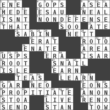 ACROSS 1. Compass dir. 4. Republicans 8. Toward the sea 12. Ancient Persian 14. He sold his birthright 15. Be tempered by heat 16. Is not 17. Unrelated to defense, as in spending 20. Not this but _ 21. "Barney Miller" actor Jack 22. Had dinner 23. Unit of acoustic absorption 27. Remaining after all deductions 29. Part of Q.E.F. 31. Printing process, for short 34. Related on the mother's side 35. Type of rug 36. United States Postal Service (abbr.) 39. Epoch 41. Austrian river, tributary to the Danube 42. Carrot, for example 43. Slow-paced one 46. Small island 47. Merit 48. Afternoon social gatherings 51. Memorize 54. Slender fish 56. Modern: prefix 58. Immeasurably long periods of time 61. Appease 66. Soon (poet.) 67. Portico 68. Moving, as bait 69. Western Nevada city 70. Transmit 71. Comedian Laurel of Laurel & Hardy 72. Pull behind DOWN 1. Give off 2. Delicate 3. Ferber et al. 4. Commissioned mil. rank 5. Bear (Spanish) 6. Baking dish 7. Beer foam 8. A saturated hydrocarbon 9. Legislators 10. 90 degrees 11. Toward shelter 13. Singer James 18. Age 19. Enemy 24. Benjamin's nick name 25. Lyricist Gershwin 26. Nathan's nickname 28. Lag or linger behind 30. Laconic 32. Beverage made from leaves 33. Rowing implement 34. First name in cosmetics 36. RI univ. 37. Distress signal 38. Coward 40. Of or related to the anus 44. "We ___ not amused" (Victoria) 45. _ tizzy (2 wds.) 49. Cuckoo 50. Put into a specified state 52. Buttocks 53. Music written for nine 54. Global Positioning Systems (abbr.) 55. Johnson of "Laugh-In" 57. Lubricates 59. Words to Nanette 60. Frozen precipitation 62. Groovy apt. 63. Small island 64. Federal power corp. 65. Car or cant ending