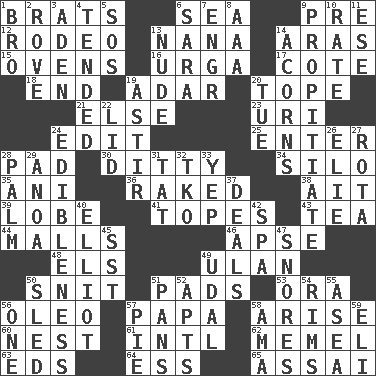 ACROSS 1. Naughty children 6. Ocean 9. Before (prefix) 12. Cowboy competition 13. Nanny 14. Ancient river in northeast Turkey 15. Baking chambers 16. Capital and largest city of Mongolia 17. ____ d'Azur (French Riviera) 18. Conclude 19. The sixth month of the Jewish calendar 20. Drink excessively 21. Otherwise 23. RI univ. 24. Prepare for publication 25. Keyboard key 28. Writing tablet 30. Simple song 34. Grain storage tower 35. Cuckoo 36. Swept the length of 38. Small island 39. Ear part 41. Drinks excessively 43. Afternoon social gathering 44. Shopping centers 46. Domed church section 48. Raised railways 49. ____ Bator, Mongolia 50. In a ____ (agitated or irritated) 51. Writing tablets 53. Mouth or opening 56. Margarine 57. Dad 58. Ascend 60. Egg locale 61. International (abbr.) 62. Klaipeda city 63. Begley and Asner 64. Curvy letter 65. Slender Brazilian palm DOWN 1. Sis' sibling 2. Be footloose 3. Arabian gulf 4. Looked after 5. Mayday 6. "Two Mules for Sister ____" 7. Engineer (abbr.) 8. American Automobile Association (abbr.) 9. Appease 10. Pace 11. Compass dir. 13. Naked 14. Oak nuts 19. Being in motion 20. Third day of the wk. 22. Hat (slang) 24. The property of being fit to eat 26. Writer Wiesel 27. Roll call or roster of names 28. Inside of hand 29. Small Philippine buffalo 31. Make lace 32. Ring climax 33. Slangy assent 37. Allots cards 40. American author Paul (1891-1958) 42. Health resort 45. Fast jet (abbr.) 47. Sounds asleep 49. Freehold land 50. Downhill vehicle 51. Baking dishes 52. Flats, for short 54. Basketball hoops 55. At sea 56. Single 57. Sliced dessert 58. Housemaid (var.) 59. Connecticut Ivy Leaguer