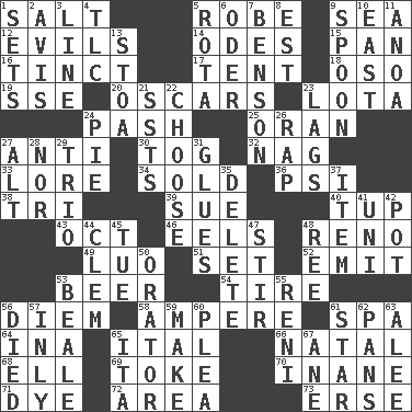 ACROSS 1. Table seasoning 5. Loose flowing garment 9. Ocean 12. Vices 14. Lyric poems 15. Baking dish 16. Colored lightly or faintly 17. Portable shelter 18. Bear (Spanish) 19. Compass dir. 20. Motion picture awards 23. Globular water bottle used in Asia 24. Romantic infatuation 25. NW Algerian seaport 27. Opposed to 30. Coat; cloak 32. Tired old horse 33. Old wives' tales, e.g. 34. Disposed of to a purchaser 36. 23rd letter of the Greek alphabet 38. Three (prefix) 39. Institute legal proceedings 40. Uncastrated adult male sheep 43. Sep. follower 46. Snakelike fish 48. Western Nevada city 49. Nilotic language 51. Put into a specified state 52. Send forth 53. Fermented drink made from hops 54. Become fatigued 56. South Vietnam president (1954) 58. Electrical Unit 61. Health resort 64. _ tizzy (2 wds.) 65. Slanted text style (abbr.) 66. Brizilian seaport 68. Pipe bend 69. Puff or smoke 70. Empty; void 71. Color 72. Length times width 73. Celtic language DOWN 1. Puts into a specified state 2. Deliberation 3. Actor's bit 4. Affectionate concern, for short 5. Roll call or roster of names 6. River in Europe 7. Gillaume's butler role 8. Eastern Standard Time (abbr.) 9. Soup utensil 10. 90 degrees 11. Small Philippine buffalo 13. Portico 21. Fast planes 22. Opt 23. Falls behind 24. Sliced dessert 26. Strike 27. Keyboard modifier key 28. Not either 29. Musical group of three 31. Adhesives 35. Keyboard key 37. A distinct part 41. Corn or form start 42. Cooking vessel 44. Clement's nick name 45. Third day of the wk. 47. Use a swizzle stick 48. To riddle 50. Speaker 53. Memphis, Tenn. Street 55. Painter Guido (1575-1642) 56. Passed on 57. In an inward manner 59. Create 60. Entreaty 61. Play the lead 62. Zero-star reviews 63. Toward shelter 65. Call ___ day 67. A saturated hydrocarbon