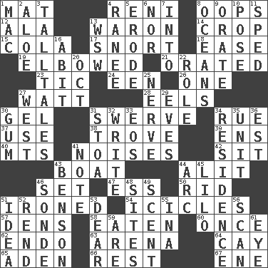 ACROSS 1. Floor covering 4. Painter Guido (1575-1642) 8. I made a mistake 12. Wing 13. Make _____ (do battle with) 14. Riding implement 15. Root beer relative 17. Derisive sound 18. Comfort 19. Shoved, as through a crowd 21. Declaimed 23. Nervous spasm 24. Car or cant ending 26. Single 27. Electrical Unit 28. Snakelike fish 30. Set 31. Turn aside suddenly 34. Sorrow 37. Purpose 38. Collection of objects 39. Followers of ems 40. Mountains (abbr.) 41. Annoying sounds 42. Be seated 43. Water vessel 44. Set down 46. Arrange properly for use 47. Double-curved letter 50. To free from 51. Pressed 54. Winter's stalactites 57. Habitations of wild animals 58. Eroded 60. Single time 62. Inside; within (prefix) 63. Sports stadium 64. Island 65. Arabian gulf 66. Repose 67. Compass dir. DOWN 1. Apple computer (short form) 2. Medicinal plant 3. Baron Munchausen's specialties 4. Indian princess (variant) 5. Eat (away) 6. Or not 7. To the inside or interior of 8. Seas 9. Speak pompously 10. Introduce or present, as a question 11. Broke a traffic law 13. Compass dir. 16. "This won't hurt ____!" 20. Sep. follower 22. Hero or heavy, e.g. 25. Impudent aggressiveness 27. 270 degrees 29. Nights before holidays 30. Chewing product 31. Portico 32. Compose 33. Greek goddess of the dawn 34. Dwelling 35. A single undivided whole 36. Eastern Standard Time (abbr.) 41. Make mention of 43. Gillaume's butler role 44. Curve 45. _ and Stitch 46. Something which is sent 48. Settings 49. Odor 51. The main thing one is thinking about 52. Tear apart 53. Letter starter 55. _ tizzy (2 wds.) 56. Skim 59. "We ___ not amused" (Victoria) 61. Sight organ