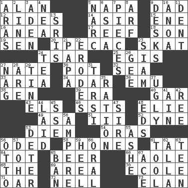 ACROSS 1. ____ Jay Lerner 5. California wine valley 9. June honoree 12. Amusement-park features 14. SW Saudi Arabia district 15. Compass dir. 16. Approach 17. Coral ridge 18. Male offspring 19. Elected rep. 20. Medicinal drug used to evoke vomiting 23. Three-handed card game 24. Russian ruler of old 25. The front part of a cuirass 27. Nathan's nickname 30. Cooking vessel 32. Ocean 33. Roberta Peters solo 34. The sixth month of the Jewish calendar 36. Australian flightless bird 38. Commissioned mil. rank 39. Period 40. Slender fish 43. Raised railways 46. Fast planes 48. Writer Wiesel 49. White ___ sheet 51. One more than two 52. Centimeter-gram-second unit of force 53. South Vietnam president (1954) 54. Mouths or openings 56. Wrote a lyric poem 58. Gives a jingle 61. Make lace 64. Small child 65. Fermented drink made from hops 66. White Person, in Hawaii 68. Definite Article 69. Length times width 70. Learning spot: Fr. 71. Boat paddle 72. 1994 drama film starring Jodie Foster 73. Flair DOWN 1. Ancient river in northeast Turkey 2. Actor's bit 3. Arabian gulf 4. Teachers' org. 5. Drug cop 6. Toward the sea 7. Parts 8. Sandy's bark 9. Writing tables 10. Small Philippine buffalo 11. Incision 13. Indian titles of respect 21. Dad 22. Eats (away) 23. Thailand, formerly 24. Afternoon social gathering 26. Turn to the right 27. Tired old horse 28. "We ___ not amused" (Victoria) 29. Prong on a fork 31. Tarsus (plural) 35. Food allowance for one day 37. Unsightly 41. The 18th letter of the Arabic alphabet 42. To sift 44. Put down 45. Compass dir. 47. Father 48. Begley and Asner 50. Electrical Unit 53. Prevent from occurring 55. American tennis player Robert 56. Von Bismarck 57. Capital of the state of Qatar 59. The bottom of a shoe or boot 60. Relating to the mouth 61. Utensil 62. Silent film actress Nazimova 63. Adolescent 65. Forbid 67. Adept person