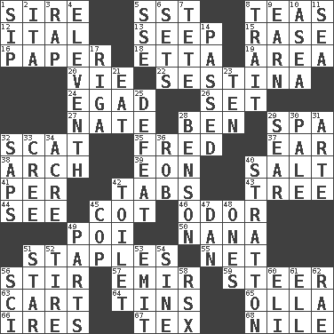 ACROSS 1. The founder of a family 5. Fast jet (abbr.) 8. Afternoon social gatherings 12. Slanted text style (abbr.) 13. Ooze 15. Raze (variant) 16. Some stationery 18. Singer James 19. Type of rug 20. Compete 22. French poetic form 24. Mild oath 26. Put into a specified state 27. Nathan's nickname 28. Benjamin's nick name 29. Health resort 32. Scram, to a cat 35. Flintstone 37. Hearing organ 38. Bowlike part 39. A really long time 40. Table seasoning 41. For each 42. Bar bills 43. Family _ (genealogy) 44. Perceive with the eye 45. Small bed 46. Scent 49. Luau course 50. Grandmother 51. Paper fasteners 55. Fish or hair follower 56. Tumult 57. Independent ruler or chieftain 59. Bull 63. Heavy open wagon 64. Airtight sealed metal containers 65. Rounded earthenware pot or jar 66. Angers 67. John Ritter's dad 68. The longest river in the world DOWN 1. Small drink 2. Call ___ day 3. Reproach for some lapse or misdeed 4. Veterans Day date 5. Compass dir. 6. Puts into a specified state 7. False hair 8. Distinguishing feature 9. Merit 10. At sea 11. Ocean 14. Went by 17. Capital of Latvia 21. Erode 23. Nine, plus one 25. Outscore 28. Gillaume's butler role 29. Singe 30. Diluted with white 31. Johnson of "Laugh-In" 32. Plant excrements 33. Algonquian 34. Measure of real estate 36. Director Reiner 40. Ski resort town in Vermont 42. Bathroom 45. Police officer (slang) 47. One of the 12 tribes of Israel 48. Washington bills 49. Components 51. Play the lead 52. Become fatigued 53. Send forth 54. Trig term 56. _-fi 58. Acura sports coupe 60. Connecticut Ivy Leaguer 61. Pipe bend 62. Actress Charlotte