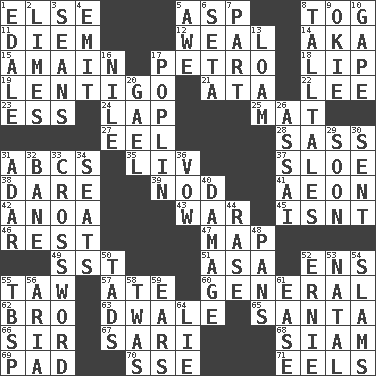 ACROSS 1. Otherwise 5. Cleo's killer 8. Coat; cloak 11. South Vietnam president (1954) 12. Welt 14. Alias (abbr.) 15. At full speed 17. Stone: prefix 18. Mouth edge 19. Small, flat, pigmented spot on the skin 21. _ moment's notice (2 wds.) 22. Area sheltered from the wind 23. Double-curved letter 24. Pet locale 25. Floor covering 27. Snakelike fish 28. Backtalk 31. Lettered men learn these first 35. 54 in ancient Rome 37. A type of plum 38. Have the gumption 39. Lower and raise head in agreement 41. Age 42. Small Philippine buffalo 43. Armed conflict 45. Is not 46. State of inaction 47. Atlas unit 49. Fast jet (abbr.) 51. White ___ sheet 52. Followers of ems 55. The 23rd letter of the Hebrew alphabet 57. Had dinner 60. Commissioned military rank 62. Sis' sibling 63. A sleeping potion; an opiate (poet.) 65. Before Barbara or Clara 66. Title for a knight 67. Indian skirt 68. Thailand, formerly 69. Groovy apt. 70. Compass dir. 71. Snakelike fish DOWN 1. Peak District village in England 2. Citrus fruits 3. Actors Connery and Penn 4. Give off 5. Deep reverence 6. Bristle 7. Piece 8. Baron Munchausen's specialties 9. Migrant worker of the '30s 10. Open wide 13. Rich soil 16. Mediterranean tributary 17. Cotton for raincoats, e.g. 20. Highlander 26. Slender Brazilian palm 29. Within a short period 30. Transmitted 31. The sixth month of the Jewish calendar 32. Object of repulsion 33. What you're doing now 34. Theater features 36. Solemn pledge 40. Break 44. To erase 48. Baking dishes 50. Bits 52. Bert's buddy 53. Relating to or accompanying birth 54. Criticizes harshly 55. Cook's measure (abbr.) 56. Roberta Peters solo 58. It was, poetically 59. Hearing organs 61. Comfort 64. Whopper