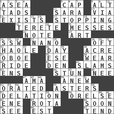 ACROSS 1. Toward the sea 5. Head covering 8. The first octave above the treble staff 11. Bits 12. "Two Mules for Sister ____" 13. By way of 14. Is 17. Discontinuing 19. Cylindrical with tapered ends 21. Makes clutter 22. Brief written record 23. Tate display 24. Compass dir. 27. Billionth: prefix 29. Often (poetically) 32. White Person, in Hawaii 34. 24 hours 36. 43,560 square feet 37. Mitch Miller's instrument 38. Compass dir. 39. Put on (as clothing) 40. Travel on or in a vehicle 41. Lair 42. Shuts with force 43. Followers of ems 44. Surprise greatly 46. Born 47. Housemaid (var.) 50. Afresh 52. Spoke pompously 55. Michaelmas daisies 57. Accusation by an informer 59. Threatening words 62. Compass dir. 63. Round or rotation of duties 64. Within a short period 65. Observe 66. Eastern Standard Time (abbr.) 67. Watch over DOWN 1. Had dinner 2. Saxophone 3. Prepare for publication 4. NE Netherlands city 5. Domesticated feline 6. Scent 7. Some stationery 8. Advice 9. Actor's bit 10. Labels 12. Compass dir. 15. Heavy duty weighing machine 16. Stalk of a moss capsule 18. Pacific Standard Time (abbr.) 20. Looked after 24. Dinah or Pauly 25. Unit of acoustic absorption 26. Forest 28. Fertile tracts in a desert 29. Sea 30. Movie unit 31. Laconic 33. Area sheltered from the wind 35. Gossips 36. Leather borer 42. Contemptuous expression 45. To (old English) 47. _ moment's notice (2 wds.) 48. Distance measurement (Brit.) 49. Goodbye (Sp.) 51. Obtain by seizing forcibly or violently 52. Lyric poems 53. French philosopher Descartes 54. Toward shelter 55. Santa ___, CA 56. A type of plum 58. Baseball player Mel 60. Boy, to dad 61. Conclude