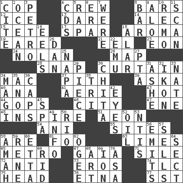 ACROSS 1. Police officer (slang) 4. Group working together 8. Taverns 12. Frozen water 13. Have the gumption 14. Actor Baldwin 15. Wig 17. Coast Guard woman 18. Scent 19. Having ears or earlike features 21. Snakelike fish 23. Age 24. Pitcher Ryan 26. Atlas unit 28. Fastener 30. Window treatment 34. Big _ 37. Heart or essence 39. "____ silly question..." 40. Santa ___, CA 41. Nest on high 43. Being at a high temperature 44. Republicans 46. Municipality 47. Compass dir. 48. Heighten or intensify 51. A really long time 54. Cuckoo 55. Settings 58. "We ___ not amused" (Victoria) 61. Egg _ yung 63. Citrus fruits 65. Paris' subway 67. Greek goddess of the earth (variant) 71. Drop; flow; fall 72. Against 73. Greek god of love 74. Affectionate concern, for short 75. Froth on beer 76. Inactive volcano in Sicily 77. Fast jet (abbr.) DOWN 1. Quote 2. Sea 3. Stone: prefix 4. Music discs 5. Reproach for some lapse or misdeed 6. Period 7. We are 8. Soap unit 9. _ vera 10. San ____ (Riviera town) 11. Examine minutely or intensely 16. Snakelike fish 18. Having or resembling wings 20. One of the 12 tribes of Israel 22. Australian flightless bird 25. California wine valley 27. Parent Teacher Association (abbr.) 29. Component 30. Riviera of "Kiss of the Spider Woman" 31. American tennis player Robert 32. Picture 33. Nathan's nickname 34. Wise men 35. At once, immediately (arch.) 36. Smile enhancers 38. Three (prefix) 42. Snake ____ (dice throw) 45. Health resort 49. Information 50. River (Sp.) 52. Petroleum 53. Nuclear Threat Initiatives 56. Gives off 57. Exchanges for money 58. Nanny 59. French philosopher Descartes 60. Singer James 62. Double curve, resembling the letter S 64. Religious group 66. To free from 68. Tate display 69. Electrically charged atom 70. White ___ sheet