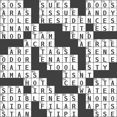 ACROSS 1. Mayday 4. Takes to court 8. Expressions of contempt or scorn 12. Ancient river in northeast Turkey 14. Come out of 16. Actor Griffith 17. Lacquered or enameled metalware 18. Homes 20. Silly 22. Teat (slang) 23. Eastern Standard Time (abbr.) 24. Allow head to fall sleepily 25. Scottish cap 28. Conclusion 30. 43,560 square feet 31. Nest on high 35. Sandy's bark 37. Labels 40. Elected reps. 41. Scent 42. Related on the mother's side 44. Small island 45. Pace 46. Utensil 47. Filthy place 48. Collect or gather 50. Is not 52. Being at a high temperature 54. Corporate head (abbr.) 55. R.R. building 58. Ocean 61. Big collection agency 63. Wetness 65. The property of being fit to eat 70. Words to Nanette 71. Assistant 72. Of or pertaining to a thread or threads 73. Tenement units (abbr.) 74. Comedian Laurel of Laurel & Hardy 75. Native american tent (variation) 76. Compass dir. DOWN 1. Smooth fabric 2. U. of Maine site 3. First course 4. Title for a knight 5. Purpose 6. Double-curved letter 7. Set of matching outer garments 8. Forbid 9. Single time 10. Lyric poems 11. System (abbr.) 13. Elected rep. 15. Singer Brickell 19. Inactive volcano in Sicily 21. And so on (abbr.) 26. Johnson of "Laugh-In" 27. Intended 29. Stop 30. Anew 32. Relief 33. Inwardly 34. Compass dir. 35. First man 36. Roll call or roster of names 38. E Mali city 39. Unemotional 41. Mouth or opening 43. Otherwise 49. The visible part of the earth's surface 51. Immediately 53. Not kosher 55. Constricts 56. Portable shelters 57. Came up 58. Oceans 59. Prepare for publication 60. Opera by Verdi 62. In a ____ (agitated or irritated) 64. Santa ___, CA 66. Benjamin's nick name 67. Biblical high priest 68. Plant excrement 69. Indian title of respect (Mr.)
