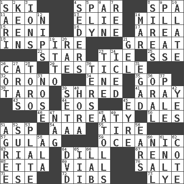 ACROSS 1. What Jean-Claude Killy likes to do 4. Practice fight 8. Health resort 11. Period of immesurable duration 13. Writer Wiesel 14. Place where flour is made 15. Painter Guido (1575-1642) 16. Centimeter-gram-second unit of force 17. Length times width 18. Motivate 21. Relatively large 22. Play the lead 23. Neckwear 25. Compass dir. 26. Feline 29. One of the two male reproductive glands 32. U. of Maine site 34. Compass dir. 35. Grand Old Party 38. Edible starchy tuberous root 39. Tear up 41. Like ___ of sunshine 43. Mayday 44. Greek goddess of the dawn 45. Peak District village in England 46. Plea 50. French article 51. Viper 54. Auto club (abbr.) 55. Hoop that covers a wheel 57. Russian prison camp 59. Pertaining to the sea 63. Monetary unit of Yemen 64. Deli pickle 67. Former U.S. Attorney General Janet 68. Singer James 69. Small bottle 70. Table seasoning 71. Compass dir. 72. Rights 73. Potassium hydroxide DOWN 1. Indian skirt 2. Peachy ____! 3. Charged atoms 4. Spring feasts 5. Strand of rope, yarn or thread 6. The 18th letter of the Arabic alphabet 7. To separate or throw off 8. Male parents of animals 9. Entreaties 10. Having winglike extensions 12. Cuts off 14. Spoil 19. "Tell ____ the Marines!" 20. Actress Charlotte 21. Set 23. Prong on a fork 24. On the rocks 26. Small bed 27. Caspian sea tributary 28. "Corrida" creature 30. Laconic 31. Mild oath 33. Characteristic smell of wine 36. Spoken 37. Diluted with white 39. Stalk of a moss capsule 40. Israeli folk dance 42. Affirmative reply 45. Jane of fiction 47. Tired old horse 48. Ringlike coral islands and reefs 49. Nervous spasm 51. Match 52. Costumes for special activities 53. Food holder 56. Hearing organs 58. Wing 60. Be tempered by heat 61. In an inward manner 62. ____ d'Azur (French Riviera) 64. Movie disc 65. One more than two 66. Experiment locale
