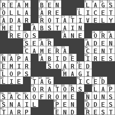 ACROSS 1. 480, 500 or 516 sheets of paper 5. Benjamin's nick name 8. Falls behind 12. Rounded earthenware pot or jar 13. "We ___ not amused" (Victoria) 14. It is permitted: Lat. 15. The sixth month of the Jewish calendar 16. Producing rotation 19. Was introduced to 20. Choose not to consume 21. Vintage cars 23. A saturated hydrocarbon 24. Mouth or opening 27. Wither 30. Arabian gulf 31. Device for capturing images 34. Penny 35. California wine valley 38. Stay 40. Angers 41. Independent ruler or chieftain 42. Flew 44. Chops off 45. Wise men 46. Falsehood 47. Label 50. On the rocks 53. Speakers 57. Infant locale 59. Italian handbag shop? 63. Religious women 64. Slow-paced one 65. Fenced enclosure 66. Lyric poems 67. Canvas cover 68. Conclude 69. Take ten DOWN 1. Wander aimlessly 2. A person who is older than you are 3. Having winglike extensions 4. Third mo. 5. Sharp remark 6. Greek god of love 7. Remaining after all deductions 8. 54 in ancient Rome 9. Adept person 10. Set 11. Filthy place 14. Actor's bit 17. American Automobile Association (abbr.) 18. Metal container 20. At sea 22. Motion picture awards 24. Baltic tributary 25. French philosopher Descartes 26. Pismires 28. Wet nurse (var.) 29. Confederate soldiers (slang) 30. Being or containing an acid 32. _ de Janeiro 33. First man 35. 1994 drama film starring Jodie Foster 36. Mine, in Marseilles 37. Corncob 39. Epoch 43. Armor plate that protects the chest 47. Instrument 48. Sandy's bark 49. Slender fish 51. Evade 52. Natives or inhabitants of Denmark 54. Drink excessively 55. Sign of things to come 56. Tear apart 58. Inconspicuous attention getter 59. Fast jet (abbr.) 60. Santa ___, CA 61. 4-wheeled motor vehicle 62. Sleep 63. Or not