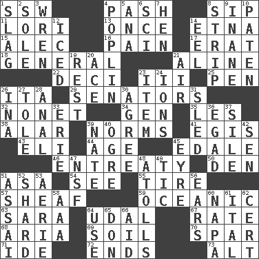 ACROSS 1. Compass dir. 4. Romantic infatuation 8. Small drink 11. Australian parrot (variant) 13. At one time in the past 14. Inactive volcano in Sicily 15. Actor Baldwin 16. Ache 17. Part of Q.E.F. 18. Commissioned military rank 21. Place in a line 22. Tenth: prefix 23. One more than two 25. Writing instrument 26. Call ___ day 29. Elected representatives 32. Music written for nine 34. Commissioned mil. rank 35. French article 38. Having or resembling wings 39. Typical standards 41. The front part of a cuirass 43. Biblical high priest 44. Grow older 45. Peak District village in England 46. Plea 50. Lair 51. White ___ sheet 54. Perceive with the eye 55. Become fatigued 57. Bundle of cut stalks of grain 59. Pertaining to the sea 63. "Two Mules for Sister ____" 64. Freehold land 67. Assign a rank or rating to 68. Roberta Peters solo 69. The visible part of the earth's surface 70. Practice fight 71. Binary compound 72. Conclusions 73. The first octave above the treble staff DOWN 1. Volcanic refuse 2. Flatfish 3. Songbird 4. Cotton for raincoats, e.g. 5. Santa ___, CA 6. _-fi 7. Layer 8. Remove all contents or possession from 9. Empty; void 10. Eucharist need 12. On the rocks 14. Snakelike fish 19. State of inaction 20. Adept person 21. Wind 23. A distinct part 24. Charged particles 26. _ tizzy (2 wds.) 27. Lacquered or enameled metalware 28. Of or related to the anus 30. Match 31. Downhill vehicle 33. One of the Great Lakes 36. Mild oath 37. Filth; sediment 39. Nathan's nickname 40. Legendary monster 42. Elected rep. 45. Jane of fiction 47. Overdraft (abbr.) 48. Ringlike coral islands and reefs 49. Nervous spasm 51. Slender Brazilian palm 52. Broken piece 53. Nest on high 56. Hearing organs 58. Auto club (abbr.) 60. California wine valley 61. Slanted text style (abbr.) 62. Certainty 64. Purpose 65. Spanish title 66. Help