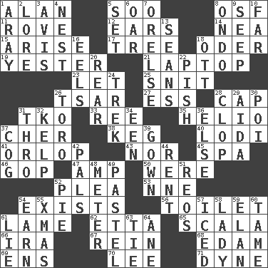 ACROSS 1. ____ Jay Lerner 5. "Barney Miller" actor Jack 8. Order of Saint Francis (abbr.) 11. Be footloose 12. Hearing organs 14. Teachers' org. 15. Originate 17. Relationship diagram 18. River in Europe 19. Of or pertaining to yesterday 21. Portable computer 23. Allow 25. In a ____ (agitated or irritated) 26. Russian ruler of old 27. Double-curved letter 28. Head covering 31. Ring climax 33. Portuguese money of account (variant) 35. Sun: prefix 37. "Mermaids" star 38. Barrel 40. Farming town in central California 41. Fourth or lowest deck 43. Or not 45. Health resort 46. Republican Party 47. Electrical Unit 50. Past tense of be (plural) 52. Entreaty 53. Compass dir. 54. Is 56. Bathroom 61. Unable to walk 62. Singer James 65. Any of the three canals of the cochlea 66. Retirement account (abbr.) 67. It's straight from the horse's mouth 68. Dutch treat 69. Followers of ems 70. Area sheltered from the wind 71. Unit of force DOWN 1. Like ___ of sunshine 2. Old wives' tales, e.g. 3. Advice 4. Egg locale 5. Arrange properly for use 6. Boat paddle 7. Threatening words 8. Southwest Nigerian state 9. Ooze 10. At a great distance 13. Seines 16. Snakelike fish 18. Baseball player Mel 20. Buttocks 22. Expression of disdain 24. Long journey 26. "Corrida" creature 28. Hoof sound 29. Opera by Verdi 30. Luau course 31. Through, poetically 32. Seaweed 34. Car or cant ending 36. Otherwise 37. Gear tooth 39. Bride's dress 42. Friends 44. Monthly bill 48. Distance measurement 49. Soft color 51. Vintage cars 52. Sliced dessert 54. Merit 55. Dec. holiday 57. On the rocks 58. Kenny Rogers chart-topper in '80 59. Flair 60. Docile 61. Whopper 63. Standoff 64. One (Scot)