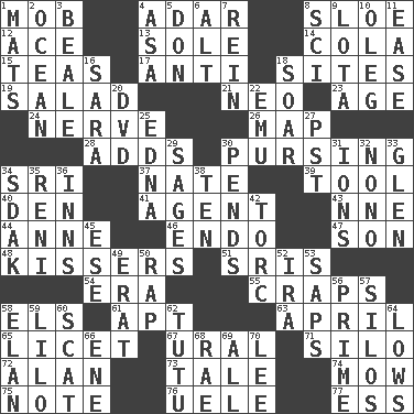ACROSS 1. Crowd into 4. The sixth month of the Jewish calendar 8. _ gin 12. Adept person 13. Flatfish 14. Root beer relative 15. Afternoon social gatherings 17. Against 18. Locates 19. Vegetable dish 21. Modern: prefix 23. Grow older 24. Effrontery 26. Atlas unit 28. Sums up 30. Puckering 34. _ Lanka 37. Nathan's nickname 39. Implement 40. Lair 41. Representative 43. Compass dir. 44. Queen of England 1702-14 46. Inside; within (prefix) 47. Male offspring 48. Smoochers 51. Indian titles of respect 54. Period 55. Dice game 58. Raised railways 61. Fitting 63. Showery time 65. It is permitted: Lat. 67. Mountain range 71. Grain storage tower 72. ____ Jay Lerner 73. Falsehood 74. Cut the grass 75. Observe 76. Ubangi River tributary 77. Double-curved letter DOWN 1. Floor coverings 2. Sea 3. Memphis, Tenn. Street 4. White ___ sheet 5. Spanish title 6. The first octave above the treble staff 7. It's straight from the horse's mouth 8. _-fi 9. Globular water bottle used in Asia 10. Cassini of fashion 11. Comfort 16. "Two Mules for Sister ____" 18. Fly high 20. Movie disc 22. Australian flightless bird 25. Pulitzer Prize-winning author Ferber 27. Pacific Standard Time (abbr.) 29. Gurus 30. Hangs 31. Charged atoms 32. Words to Nanette 33. Small, secluded valley 34. Neighbor of Neb. 35. Painter Guido (1575-1642) 36. Lodging establishments 38. "___ Little Indians" 42. Torque (variant) 45. Compass dir. 49. Part of Q.E.F. 50. Strike 52. Lyricist Gershwin 53. Plant excrements 56. A-one 57. Grain storage towers 58. Flair 59. _ and Stitch 60. Scram, to a cat 62. Ballerina skirt 64. Coldest temperatures 66. Compass dir. 68. Actress Charlotte 69. Everything 70. Area sheltered from the wind