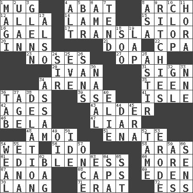 ACROSS 1. Java container 4. Blind as ____ 8. Bowlike part 12. Silent film actress Nazimova 14. Unable to walk 15. Grain storage tower 16. Highlander 17. Interpreter 20. Taverns 21. ___ good deed 22. Accounting whiz (abbr.) 23. Olfactory organs 27. Brightly colored fish 29. _ the terrible 31. Public display of a written message 34. Sports stadium 35. Adolescent 36. Small amounts or degrees 39. Compass dir. 41. Capri or Wright 42. Eons 43. Tree or shrub in the Birch family 46. Actor Lugosi 47. One who doesn't tell the truth 48. Mine, in Marseilles 51. Related on the mother's side 54. Soggy 56. Wedding promise 58. Ancient river in northeast Turkey 61. The property of being fit to eat 66. Greater amount 67. Small Philippine buffalo 68. Balmoral and tarboosh 69. Genesis locale 70. Long (Scottish) 71. Part of Q.E.F. 72. Double-curved letter DOWN 1. Wise men 2. Uhlan (variant) 3. American astronaut and politician John 4. Keyboard modifier key 5. Oblong piece of solid material 6. Nursemaid (var.) 7. Look after 8. White ___ sheet 9. Actors Guy, Robert Welles, and Clint 10. Hoof sound 11. Israeli folk dance 13. In addition 18. "Barney Miller" actor Jack 19. Pet locale 24. Title for a knight 25. First lady 26. Without 28. Moving or stirring 30. Relating to the nose 32. Set 33. Compass dir. 34. Indian state 36. Bar bill 37. Mature 38. Conveyance 40. Writer Wiesel 44. Daniel's nick name 45. Epoch 49. Petroleum 50. Binary compound 52. Not wild 53. Eat (away) 54. Welt 55. Pulitzer Prize-winning author Ferber 57. Single time 59. Ancient Greek god of war 60. Elected reps. 62. Paper or plastic container 63. Hearing organ 64. Health resort 65. Fast jet (abbr.)