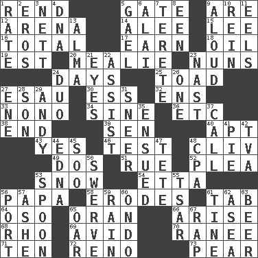 ACROSS 1. Tear apart 5. Yard entry 9. "We ___ not amused" (Victoria) 12. Sports stadium 14. Toward shelter 15. Area sheltered from the wind 16. Add up to 17. Merit 18. Lubricate 19. Eastern Standard Time (abbr.) 20. Ear of corn 23. Religious women 24. 24-hour periods 25. Frog relative 27. He sold his birthright 30. Double-curved letter 32. Followers of ems 33. Words to Nanette 34. Trig term 36. And so on (abbr.) 38. Conclude 39. Elected rep. 40. Fitting 43. Consenting reply 46. Trial 48. 154 in Roman numerals 49. Two (Sp.) 51. Regret 52. Entreaty 53. Frozen precipitation 54. Singer James 56. Dad 58. Eats (away) 61. Keyboard key 64. Bear (Spanish) 65. Northwest Algerian city 66. Originate 68. 17th letter of the Greek alphabet 69. Enthusiastic 70. The wife of a rajah (variant) 71. "___ Little Indians" 72. Western Nevada city 73. Lightbulb-shaped fruit DOWN 1. Assign a rank or rating to 2. Greek god of love 3. Remaining after all deductions 4. Heredity factor (abbr.) 5. Highlander 6. Jai ____ 7. Cigar-shaped 8. Car or cant ending 9. Verbally 10. It's straight from the horse's mouth 11. Snakelike fish 13. _ mater 21. Sight organs 22. Aid 23. Political cartoonist Thomas 24. Superhero pair 26. Single 27. Compass dir. 28. Male child 29. Actor Griffith 31. Scornful expression 35. Followed as a consequence or result 37. Give a ring to 41. Sliced dessert 42. Federal power corp. 44. Pulitzer Prize-winning author Ferber 45. "Barney Miller" actor Jack 47. Wig 48. Numbers guy (abbr.) 50. Turn aside suddenly 53. Soup utensil 55. Russian ruler of old 56. Left side of a ship or aircraft 57. American tennis player Robert 59. Precipitation 60. Southwest Nigerian state 61. Prong on a fork 62. At sea 63. Fermented drink made from hops 65. Boat paddle 67. Hit sharply and swiftly