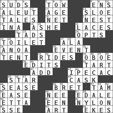 ACROSS 1. Beer foam 5. Pull behind 8. Followers of ems 11. Eskimo relative 13. Grow older 14. A type of plum 15. Lies 16. Fish or hair follower 17. Egg locale 18. _ tizzy (2 wds.) 19. American tennis player Robert 21. Shoestrings 22. Small amounts or degrees 24. Elects 25. Bathroom 27. Wing 29. Small Philippine buffalo 30. Happening 32. Portable shelter 33. Amusement-park features 35. Mitch Miller's instrument 39. Prepares for publication 41. Small pie 42. Increase 43. Medicinal drug used to evoke vomiting 45. Play the lead 48. Keg 49. Gospel singer Marvin 50. Cy Young winner Saberhagen 52. Scottish cap 55. Relaxation 56. Born 57. Peak District village in England 59. Singer James 60. Car or cant ending 61. Thermoplastic polyamide 62. Compass dir. 63. Tate display 64. Makes supply last DOWN 1. Suttee (variant) 2. ____ Bator, Mongolia 3. Accusation by an informer 4. Institute legal proceedings 5. Hyperbolic tangent 6. Double curve, resembling the letter S 7. Dripping 8. Choose 9. Olfactory organs 10. Puts into a specified state 12. Sadhe (variant) 14. Fastener 20. Fast jet (abbr.) 21. Grant temporary use of 23. Having winglike extensions 25. Make lace 26. Single 27. "___ Maria" 28. French article 30. Begley and Asner 31. Lugs 33. To free from 34. It would 36. Sass 37. Mouth or opening 38. And so on (abbr.) 40. Have the gumption 43. Frozen water 44. Eucharist need 45. Theater features 46. Clothes sense 47. Toward the sea 49. Perceives with the eye 50. Fermented drink made from hops 51. Monthly bill 53. _ vera 54. Not women's 56. Teachers' org. 58. Color
