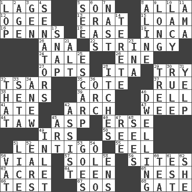ACROSS 1. Falls behind 5. Male offspring 8. Silent film actress Nazimova 12. Double curve, resembling the letter S 13. Part of Q.E.F. 15. Rich soil 16. Actor Sean's family 18. Comfort 19. South American Indian 20. Santa ___, CA 22. Slender, wiry 24. Lie 26. Compass dir. 27. Elects 28. Call ___ day 29. Attempt to accomplish something 32. Russian ruler of old 35. ____ d'Azur (French Riviera) 37. Sorrow 38. Coop moms 39. Curve 40. Small valley 41. Had dinner 42. Bowlike part 43. Shed a tear 44. The 23rd letter of the Hebrew alphabet 45. Cleo's killer 46. Celtic language 49. Big collection agency 50. Stitch closed the eyes of (a falcon) 51. Small, flat, pigmented spot on the skin 55. Snakelike fish 56. Small bottle 57. Flatfish 59. Locates 63. Measure of real estate 64. Adolescent 65. Delicate 66. Trial 67. Mayday 68. Yard entry DOWN 1. Trim (branches) 2. Personal question 3. Commissioned military rank (abbr.) 4. Elected representatives 5. Perceive with the eye 6. Mouths or openings 7. Political cartoonist Thomas 8. Place in a line 9. Protracted 10. Made of lace 11. Nursemaid (var.) 14. Cylindrical with tapered ends 17. Fastener 21. The first octave above the treble staff 23. _ tizzy (2 wds.) 25. Fortification 28. Skin irritations 29. Family _ (genealogy) 30. Governing power 31. Sharp bark 32. Not this but _ 33. Bristle 34. Afresh 36. The grampus (Milton) 40. Home 42. Aid 45. Tate display 47. Portuguese money of account (variant) 48. Observes 49. An arm off of a larger body of water 51. Louse (plural) 52. Hearing organs 53. Leaves 54. Butter sub 56. Large container 58. Followers of ems 60. Afternoon social gathering 61. Eastern Standard Time (abbr.) 62. A female animal or person