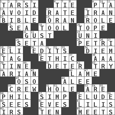 ACROSS 1. Tarsus (plural) 6. Standoff 9. Parent Teacher Assoc. 12. Stay clear from 13. Pace 14. SW Asia republic 15. The Good Book 16. NW Algerian seaport 17. Hero or heavy, e.g. 18. Ocean 19. Implement 20. Drink excessively 21. Abrupt rush of wind 23. Single; one (prefix) 24. Stalk of a moss capsule 25. _ dish (used to culture cells) 28. Biblical high priest 30. Prepares for publication 34. South Vietnam president (1954) 35. Label 36. Value system 38. American Automobile Association (abbr.) 39. Prong on a fork 41. Prevent from occurring 43. Attempt 44. Believer in; advocate of (suffix) 46. Unable to walk 48. Bear (Spanish) 49. Toward shelter 50. Group working together 51. Opening into or through something 53. "We ___ not amused" (Victoria) 56. Silvers or Donahue 57. Simple or foolish person 58. Evade 60. Observes 61. Nights before holidays 62. Ms. Damita and namesakes 63. Big collection agency 64. Nine, plus one 65. Confronts DOWN 1. Keyboard key 2. Deliberation 3. Loose flowing garment 4. Fodder prepared in a silo 5. Binary compound 6. Pacific island yam 7. Slanted text style (abbr.) 8. Car or cant ending 9. Conciliate 10. Falsehood 11. A saturated hydrocarbon 13. Carrot, for example 14. Pressed 19. Sadhe (variant) 20. Uncastrated adult male sheep 22. Shoshoni 24. Seigniories (variant) 26. Stern 27. "If ____ say so..." 28. Singer James 29. Den 31. It would 32. Definite Article 33. Be seated 37. Cell (Danish) 40. Artist's stands 42. Actress Charlotte 45. Immediately 47. Ear of corn 49. High mountains 50. "Mermaids" star 51. Hub of activity 52. Sign of things to come 54. Governing power 55. Prepare for publication 56. 23rd letter of the Greek alphabet 57. Arrange properly for use 58. Shade tree 59. Double-curved letter