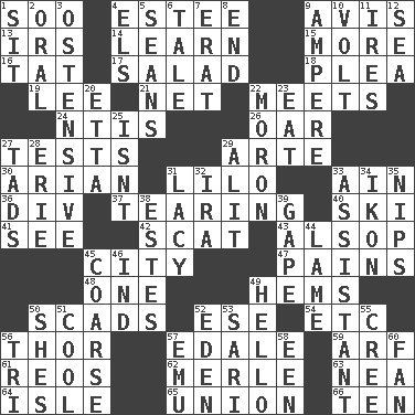 ACROSS 1. "Barney Miller" actor Jack 4. First name in cosmetics 9. Opinion 13. Big collection agency 14. Memorize 15. Greater amount 16. Make lace 17. Vegetable dish 18. Entreaty 19. Area sheltered from the wind 21. Fish or hair follower 22. Confronts 24. Nuclear Threat Initiatives 26. Rowing implement 27. Trials 29. Johnson of "Laugh-In" 30. Believer in; advocate of (suffix) 31. _ and Stitch 33. The 18th letter of the Arabic alphabet 36. HTML Container Element 37. Rending 40. What Jean-Claude Killy likes to do 41. Perceive with the eye 42. Leave at once 43. Columnist Joseph or Stewart 45. Municipality 47. Aches 48. Single 49. Is hesitant and indecisive 50. Tons 52. Compass dir. 54. And so on (abbr.) 56. Son of Odin 57. Peak District village in England 59. Sandy's bark 61. Vintage cars 62. Haggard of country music 63. Teachers' org. 64. Small island 65. The state of being joined or united 66. "___ Little Indians" DOWN 1. Be seated 2. Taken by mouth 3. Clearly or manifestly demonstrative 4. Raised railways 5. Actors Connery and Penn 6. Lie 7. Part of Q.E.F. 8. Conclusion 9. Electrical Unit 10. Electrical Unit 11. Angers 12. Ocean 20. Singer James 22. Person of subnormal intelligence 23. Consume 25. Is not 27. Small boys 28. One of the Great Lakes 29. Set down 31. Made of lace 32. Retirement account (abbr.) 33. Helper 34. Picture 35. Pinches, bites 38. _____ Park, CO 39. Open wide 44. Unable to walk 45. Unrefined 46. Indiana (abbr.) 49. Phone greeting 50. "______ My Girl" (Turtles hit) 51. Calm and collected 52. Locale of original sin 53. Indian skirt 55. Algonquian 56. Three (prefix) 57. Australian flightless bird 58. Car or cant ending 60. Air blower