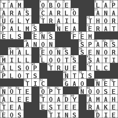 ACROSS 1. Scottish cap 4. Mitch Miller's instrument 8. Pet locale 11. Caspian sea tributary 13. Monte _, Las Vegas Hotel/Casino 15. Santa ___, CA 16. Unsightly 17. Go after with the intent to catch 18. Son of Odin 19. Insides of hands 21. Teachers' org. 22. Part of Q.E.F. 23. Raised railways 24. Followers of ems 27. Opposite of masc. 29. Soon (poet.) 30. Practice fights 34. Actor Linden 36. Immeasurably long periods of time 39. Sir (Sp.) 40. Place where flour is made 41. Plunders 43. Suttee (variant) 44. Columnist Joseph or Stewart 46. Loyal 47. Affectionate concern, for short 48. Ground plans 49. Nuclear Threat Initiatives 51. Nervous spasm 53. E Mali city 54. Fish or hair follower 57. Make mention of 60. Elect 63. Trap for birds or small mammals 65. Toward shelter 66. Sycophant 69. Housemaid 70. Afternoon social gathering 71. First name in cosmetics 72. Immoral or dissolute person 73. Greek goddess of the dawn 74. Metal containers 75. Expire DOWN 1. Grayish beige 2. Therefore, facetiously 3. Shopping centers 4. Sep. follower 5. Long, evenly shaped piece 6. Northwest Algerian city 7. Writer Wiesel 8. Cowardly lion portrayer 9. Small Philippine buffalo 10. Role in a play 12. Symbol (abbr.) 14. Norwegian king 18. Storms 20. Elected rep. 25. Christmas carol 26. Snout, nose 28. Double-curved letter 29. One to whom something is allotted 31. Of or related to the anus 32. College mil. group 33. Indian title of respect (Mr.) 34. Land elevation 35. In addition 37. And not 38. Feeling sharp psychological pain 40. Atlas unit 42. Stalk of a moss capsule 45. 23rd letter of the Greek alphabet 50. Electrically charged atom 52. ____ d'Azur (French Riviera) 54. Wanderer 55. 1973 Nobel Price Winner (Physics) Leo 56. Giggle 57. Nathan's nickname 58. Butter sub 59. Afternoon social gatherings 61. Mail 62. Jacques of French films 64. Boat paddle 67. Lair 68. It is so