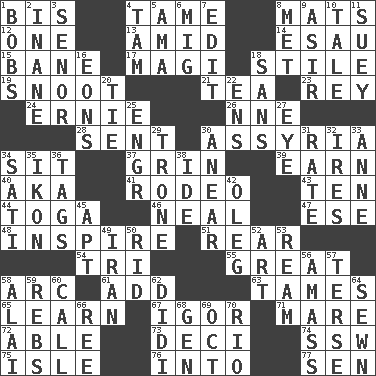 ACROSS 1. Again 4. Not wild 8. Floor coverings 12. Single 13. Among 14. He sold his birthright 15. Object of repulsion 17. Wise men 18. Vertical member of a panel or frame 19. Snob 21. Beverage made from leaves 23. Marina Del _, California 24. Bert's buddy 26. Compass dir. 28. Emitted 30. Nineveh was its capital 34. Be seated 37. Amused look 39. Merit 40. Alias (abbr.) 41. Cowboy competition 43. "___ Little Indians" 44. Ancient Roman robe 46. Actress Patricia 47. Compass dir. 48. Stimulate to action 51. Buttocks 54. Three (prefix) 55. Relatively large 58. Curve 61. Say or write further 63. Makes less strong or intense 65. Memorize 67. Composer Stravinsky 71. Female horse 72. Competent 73. Tenth: prefix 74. Compass dir. 75. Capri or Wright 76. To the inside or interior of 77. Elected rep. DOWN 1. Moves up and down 2. Silly 3. Sir (Sp.) 4. Scottish cap 5. Housemaid (var.) 6. Russian fighter aircraft 7. Prepare for publication 8. Was introduced to 9. SW Saudi Arabia district 10. Falsehood 11. Chop _ 16. Immeasurably long periods of time 18. Without 20. Neckwear 22. Followers of ems 25. Engineer (abbr.) 27. Sight organ 29. Heavy duty weighing machine 30. Approach 31. Pace 32. Angers 33. Singer Murray 34. Suttee (variant) 35. Image 36. Labels 38. Binary compound 42. Cassini of fashion 45. Fitting 49. SW Asia republic 50. To free from 52. Nonscientific branch of learning 53. 480, 500 or 516 sheets of paper 56. Collect or gather 57. Laconic 58. Mountain range southwest of Kyrgyzstan 59. Confederate soldiers (slang) 60. Give a ring to 62. "You Light Up My Life" star Conn 64. Stitched 66. To sift 68. Commissioned mil. rank 69. Sep. follower 70. _ de Janeiro