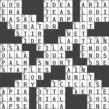 ACROSS 1. Thick or sticky substance 4. It may be bright or harebrained 8. Roberta Peters solo 12. Epoch 13. Afternoon social gatherings 14. Farming town in central California 15. Rhinal 18. Canvas cover 19. Plunder 20. Legislator 22. Car dealer's back yard 23. Use a swizzle stick 24. Soggy 25. Binary compound 26. Of or relating to Laos or its people 30. Girls' org. (abbr.) 33. Of or pertaining to a thread or threads 36. Inside; within (prefix) 37. Spanish pot 39. Fr. "Yes" 40. Extremities 41. Inside of hand 42. Derisive sound 44. Compass dir. 45. Paper fasteners 47. The 18th letter of the Arabic alphabet 50. Period of immesurable duration 51. A single undivided whole 53. Attempt 54. Winter's stalactites 57. Capital of Western Samoa 59. Von Bismarck 61. Nest on high 63. Austrian-born American filmmaker Fritz 64. Monetary unit of Yemen 65. Distress signal 66. Domed church section 67. Actor Lugosi 68. Compass dir. DOWN 1. Commissioned military rank (abbr.) 2. Mouths or openings 3. Fertile tracts in a desert 4. "Tell ____ the Marines!" 5. Letter starter 6. Ewer handle 7. Cleo's killer 8. One to whom something is allotted 9. Carrot, for example 10. Wedding promise 11. Small island 16. Opposed to 17. Put down 21. Unclean, religiously 22. Lion 24. Armed conflict 26. Den 27. Lodging establishments 28. Sums up 29. Characteristic smell of wine 30. Republicans 31. Narrow board 32. Silent film actress Nazimova 34. Charged atoms 35. Nilotic language 38. Electrical Measurement 42. Elected rep. 43. "Change" in Tahitian 46. Myrna of the movies 48. South American Indian 49. The longest river in the world 52. Laconic 53. Airtight sealed metal containers 54. Slanted text style (abbr.) 55. Root beer relative 56. The Jewish people; Israel 57. In the manner of 58. Infant food 59. Globe 60. Make a knot 62. Compass dir.