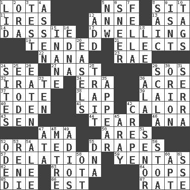 ACROSS 1. Globular water bottle used in Asia 5. Science/research agcy. 8. Be seated 11. Angers 12. Singer Murray 13. White ___ sheet 14. Hyrax 17. Residence 19. Looked after 21. Chooses 22. Grandmother 23. Actress Charlotte 24. Perceive with the eye 27. Political cartoonist Thomas 29. Distress signal 32. Feeling or showing extreme anger 34. Epoch 36. Land measure 37. Haul 38. Infant locale 39. Den 40. Paradise 41. Small drink 42. Bodily heat indicating an inflammation 43. Elected rep. 44. Pull apart 46. Santa ___, CA 47. Nanny (var.) 50. Ancient Greek god of war 52. Declaimed 55. Window treatments 57. Accusation by an informer 59. Gossips 62. Compass dir. 63. Round or rotation of duties 64. I made a mistake 65. Pass on 66. Eastern Standard Time (abbr.) 67. Assign a rank or rating to DOWN 1. Hat (slang) 2. Mouth or opening 3. Trial 4. NE Netherlands city 5. Compass dir. 6. Scornful expression 7. Chap (slang) 8. Ketch in the Levant 9. Is not 10. Labels 12. Find the sum of 15. Lacking in sense or substance 16. Pulitzer Prize-winning author Ferber 18. Area sheltered from the wind 20. Artist's stands 24. Settings 25. Wear away 26. Ingested 28. Distinguishing feature 29. Any of the three canals of the cochlea 30. Constellation of myth 31. Father Junipero _ 33. Nine, plus one 35. Seem 36. Wing 42. Streamer paper 45. Like ___ of sunshine 47. _ moment's notice (2 wds.) 48. Distance measurement (Brit.) 49. Goodbye (Sp.) 51. Sir (Sp.) 52. Wrote a lyric poem 53. Painter Guido (1575-1642) 54. Toward shelter 55. Heredity factor (abbr.) 56. Portico 58. Baseball player Mel 60. Fitting 61. Compass dir.