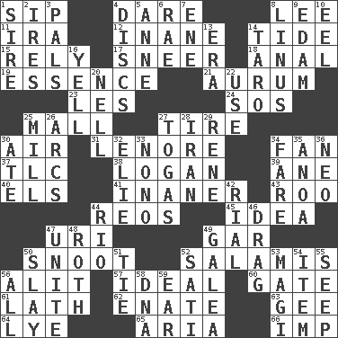 ACROSS 1. Small drink 4. Have the gumption 8. Area sheltered from the wind 11. Lyricist Gershwin 12. Empty; void 14. Event that recurs at intervals 15. Have confidence or faith in 17. Contemptuous expression 18. Of or related to the anus 19. Substance 21. Gold (Symbol: Au) 23. French article 24. Mayday 25. Promenade 27. Become fatigued 30. Atmosphere 31. Poe poem 34. Air blower 37. Affectionate concern, for short 38. Utah city north of Ogden 39. One (Scot) 40. Raised railways 41. More empty; more void 43. Friend of Pooh 44. Vintage cars 45. It may be bright or harebrained 47. RI univ. 49. Slender fish 50. Snout, nose 52. Deli grouping 56. Came down and settled, as after flight 57. Standard of perfection 60. Yard entry 61. Thin strip of wood or metal 62. Related on the mother's side 63. Unit of force equal to gravity 64. Sodium hydroxide 65. Operatic vocal solo 66. Naughty child DOWN 1. Father 2. Angers 3. Friends 4. Plates 5. Queen of England 1702-14 6. Actress Charlotte 7. Compass dir. 8. "_ and Lucy" (Charlie Brown theme song) 9. Dutch treat 10. Snakelike fish 13. Period 14. Edible starchy tuberous root 16. Shout 20. 1994 drama film starring Jodie Foster 22. Purpose 25. Place where flour is made 26. Arches 27. Ancient Roman robes 28. SW Asia republic 29. French philosopher Descartes 30. Had dinner 32. Writer Wiesel 33. Words to Nanette 34. Conductor's collection 35. Small Philippine buffalo 36. Modern: prefix 42. Monetary unit of Yemen 44. _ de Janeiro 46. To be drawn or hauled along 47. Join together 48. Writer of Portnoy's Complaint (1969) 49. An organ shaped like a helmet 50. Kill 51. Standoff 52. Suttee (variant) 53. Wise men 54. Detail 55. Ooze 56. Everything 58. Heredity factor (abbr.) 59. Ewer handle