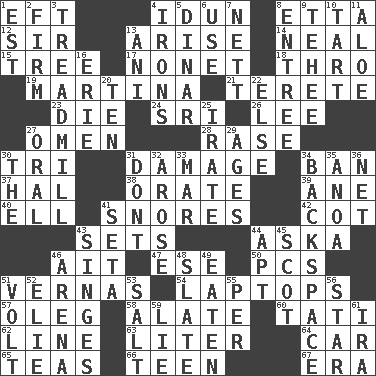 ACROSS 1. Bank Draft (abbr.) 4. Goddess of spring and wife of Bragi 8. Singer James 12. Title for a knight 13. Ascend 14. Anneal 15. Relationship diagram 17. Music written for nine 18. Through, poetically 19. Chrissie's court nemesis 21. Cigar-shaped 23. Expire 24. Indian title of respect (Mr.) 26. Area sheltered from the wind 27. Sign of things to come 28. Raze (variant) 30. Three (prefix) 31. Break 34. Forbid 37. Actor Linden 38. Declaim 39. One (Scot) 40. Pipe bend 41. Sounds asleep 42. Small bed 43. Arranges properly for use 44. "____ silly question..." 46. Small island 47. Compass dir. 50. Personal Computers (abbr.) 51. Actresses Bloom and Felton 54. Portable computers 57. Cassini of fashion 58. Having winglike extensions 60. Jacques of French films 62. Actor's bit 63. 61 cubic inches 64. 4-wheeled motor vehicle 65. Afternoon social gatherings 66. Adolescent 67. Epoch DOWN 1. Eastern Standard Time (abbr.) 2. Unshakable 3. Excercise machine 4. Metal shackles 5. Middle Eastern gold or silver currency 6. Purpose 7. Remaining after all deductions 8. Main course 9. Giggle 10. Small pie 11. _ vera 13. Cuckoo 16. 4th largest of the Great Lakes 20. "___ Little Indians" 22. Otherwise 25. Feeling or showing extreme anger 27. Relating to the mouth 29. Eons 30. Definite Article 31. Do not 32. Came up 33. Third mo. 34. Keyboard key 35. Small Philippine buffalo 36. Fish or hair follower 41. Bristle 43. Burns superficially 44. Fitting 45. Native of Scotland 46. Sports stadium 48. Chalkboard 49. Consumed 51. Electrical Unit 52. Writer Wiesel 53. Table seasoning 55. For each 56. Play the lead 59. Falsehood 61. Lyricist Gershwin