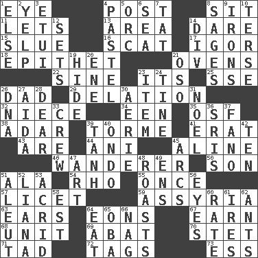 ACROSS 1. Sight organ 4. Mail 8. Be seated 11. Allows 13. Type of rug 14. Have the gumption 15. Change direction abruptly 16. Jazz singing style 17. Composer Stravinsky 18. Curse 21. Baking chambers 22. Trig term 23. It is 25. Compass dir. 26. June honoree 29. Accusation by an informer 32. Sibling's daughter 34. Car or cant ending 35. Order of Saint Francis (abbr.) 38. The sixth month of the Jewish calendar 39. Singer Mel 41. Part of Q.E.F. 43. "We ___ not amused" (Victoria) 44. Cuckoo 45. Place in a line 46. Roamer 50. Male offspring 51. In the manner of 54. 17th letter of the Greek alphabet 55. At one time in the past 57. It is permitted: Lat. 59. Nineveh was its capital 63. Hearing organs 64. Immeasurably long periods of time 67. Merit 68. A single undivided whole 69. Blind as ____ 70. Proofreading order 71. Bit 72. Labels 73. Curvy letter DOWN 1. Otherwise 2. Sharp bark 3. Needle case 4. Soft color 5. The grampus (Milton) 6. Ocean 7. Make lace 8. Gurus 9. Removes the wrinkles 10. Laconic 12. Arranges properly for use 14. HTML Container Element 19. Flintstone garb 20. Compass dir. 21. Bear (Spanish) 23. A whole individual unit 24. Prong on a fork 26. Heredity factor (abbr.) 27. Opera by Verdi 28. Letter starter 30. Nest on high 31. Christmas carol 33. Ship's personnel 36. Indian titles of respect 37. Papal veil 39. Hyperbolic tangent 40. Southwest Nigerian state 42. Nine, plus one 45. Curves 47. Nonscientific branch of learning 48. Ridicules or criticizes harshly 49. Followers of ems 51. Eskimo relative 52. Woody, climbing, usually tropical plant 53. Bitter 56. Sight organs 58. Eastern Standard Time (abbr.) 60. Pace 61. Angers 62. Pismires 64. Erode 65. Chief or king in Benin or Nigeria 66. Tired old horse