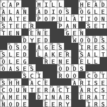 ACROSS 1. Head covering 4. Place where flour is made 8. Froth on beer 12. Actor Alda or Thicke 14. Goodbye (Sp.) 16. Stare 17. Nathan's nickname 18. Census information 20. Guide 22. Baking dish 23. Arrange properly for use 24. "___ Little Indians" 25. Compass dir. 28. Commissioned military rank (abbr.) 30. Colored 31. Forest 35. Bear (Spanish) 37. Eons 40. Angers 41. Downhill vehicle 42. Member of a famous L.A. basketball team 44. Table seasoning 45. Cassini of fashion 46. French philosopher Descartes 47. Pipe bend 48. Fertile tracts in a desert 50. Likelihood 52. _-fi 54. Friend of Pooh 55. Small bed 58. Quiet! 61. Adept person 63. Get up 65. Act in opposition 70. Arches 71. So be it 72. Middle Eastern gold or silver currency 73. Part of Q.E.F. 74. Thickened enlargement 75. Suggestive of the supernatural 76. Big collection agency DOWN 1. 2nd pers. sing. pres. of can (arch.) 2. Having winglike extensions 3. Eucharist need 4. Atlas unit 5. Wedding promise 6. Mouth edge 7. Central Nebraska county 8. Being at a high temperature 9. Armor plate that protects the chest 10. Medicinal plant 11. Incision 13. Born 15. Volcanic refuse 19. Afresh 21. Marina Del _, California 26. Actress Patricia 27. _ Allan Poe 29. Annoying sounds 30. Evades 32. Of the mouth 33. Small valley 34. Fast jet (abbr.) 35. Rounded earthenware pot or jar 36. Observes 38. Make supply last 39. Sir (Sp.) 41. "Barney Miller" actor Jack 43. Make new 49. Get outta here! 51. ___ good deed 53. On the rocks 55. High-altitude cloud 56. Motion picture award 57. Trials 58. Skim 59. Same (prefix) 60. Became colored 62. One of the Great Lakes 64. Actress Charlotte 66. Compass dir. 67. A saturated hydrocarbon 68. Auto 69. Attempt to accomplish something