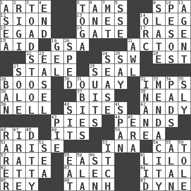 ACROSS 1. Johnson of "Laugh-In" 5. Scottish caps 9. Health resort 12. The Jewish people; Israel 13. Washington bills 14. Cassini of fashion 15. Mild oath 16. Yard entry 17. To erase 18. Assist 19. Girls' org. (abbr.) 21. NE Massachussets city 22. Ooze 24. Compass dir. 26. Eastern Standard Time (abbr.) 27. Lacking originality or spontaneity 28. Lick closed 29. Expressions of contempt or scorn 30. A city in N France, SE of Calais 32. Naughty children 36. _ vera 37. Twice 38. Anneal 39. 1994 drama film starring Jodie Foster 40. Settings 42. "60 Minutes" Commentator Rooney 43. Sliced desserts 44. Hangs 46. To free from 49. It is 50. Length times width 51. Ascend 53. _ tizzy (2 wds.) 54. Feline 57. Assign a rank or rating to 58. Compass direction 61. _ and Stitch 62. Singer James 63. Actor Baldwin 64. Slanted text style (abbr.) 65. Marina Del _, California 66. Hyperbolic tangent 67. Unit of force DOWN 1. At sea 2. Swiss mountan, "Queen of the Mountains" 3. Inedible or poisonous agaric 4. Conclude 5. Ancient Roman robe 6. Santa ___, CA 7. Was introduced to 8. Compass dir. 9. Chalkboard 10. Mexican monetary units 11. Rep 14. The grampus (Milton) 19. Set 20. Hurried 21. Leather borer 23. Artist's stand 24. Gospel singer Marvin 25. Declare 27. Flatfish 28. Sets of matching outer garments 29. Prohibit 31. Off-Broadway awards 32. Empty; void 33. Ananias' fault 34. Writing tablets 35. Stealthy 40. Be seated 41. Connect, as a bridge 43. Sliced dessert 45. Period 46. More uncommon 47. Feeling or showing extreme anger 48. Simple song 52. Ocean 53. Hankering 55. ____ Jay Lerner 56. Lacquered or enameled metalware 58. Consume 59. According to 60. Elected rep. 61. Flaplike covering