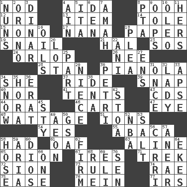 ACROSS 1. Allow head to fall sleepily 4. Opera by Verdi 8. "Silly old bear" 12. RI univ. 13. A distinct part 14. Lacquered or enameled metalware 15. Words to Nanette 17. Grandmother 18. Some stationery 19. Slow-paced one 21. Actor Linden 23. Mayday 24. Lowest deck of a ship 26. Born 28. Comedian Laurel of Laurel & Hardy 30. Player piano 34. A female animal or person 37. Travel on or in a vehicle 39. Fastener 40. Not either 41. Portable shelters 43. Music discs 44. Mouths or openings 46. Haul 47. Sight organ 48. Electrical Measurement 51. Charged atoms 54. Consenting reply 55. Phillipine bananalike plant 58. Possessed 61. Clumsy lout 63. Place in a line 65. Greek mythologigal hunter 67. Angers 71. Long journey 72. The Jewish people; Israel 73. General guideline 74. Actress Charlotte 75. Relaxation 76. Chow _ 77. Big collection agency DOWN 1. Religious women 2. U. of Maine site 3. Middle Eastern gold or silver currency 4. The 18th letter of the Arabic alphabet 5. Call ___ day 6. Lair 7. Nanny 8. Parent Teacher Assoc. 9. I made a mistake 10. Margarine 11. Possessive pronoun 16. Petroleums 18. Entreaty 20. Car dealer's back yard 22. Cuckoo 25. Component 27. Followers of ems 29. Sibling's daughter 30. _ dish (used to culture cells) 31. At one time in the past 32. Kenny Rogers chart-topper in '80 33. Domed church section 34. Overwhelm 35. Israeli folk dance 36. Part of Q.E.F. 38. Heredity factor (abbr.) 42. Portico 45. Filthy place 49. A really long time 50. Girls' org. (abbr.) 52. Basketball assoc. 53. Table seasoning 56. High-altitude cloud 57. Approach 58. Stockings 59. Roberta Peters solo 60. "Vaya con ____" 62. Become taut 64. Makes supply last 66. Single 68. Sorrow 69. Biblical high priest 70. Elected rep.