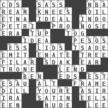 ACROSS 1. Music discs 4. Backtalk 8. Basketball assoc. 11. 480, 500 or 516 sheets of paper 13. Leg joints 15. Petroleum 16. Inactive volcano in Sicily 17. Perfect 18. Southeast Asian peninsula 19. _ dish (used to culture cells) 21. Adept person 22. Olfactory organ 23. Epoch 24. Uncastrated adult male sheep 27. Coat; cloak 29. The main thing one is thinking about 30. Mexican monetary units 34. Double-curved letter 36. Hats (slang) 39. Sadhe (variant) 40. Send forth 41. Maternal 43. Family _ (genealogy) 44. Having threads 46. Neighbor of Neb. 47. Ewer handle 48. Heavy duty weighing machine 49. Grant temporary use of 51. Benjamin's nick name 53. Begley and Asner 54. Eastern Standard Time (abbr.) 57. Son of Isaac 60. Keyboard modifier key 63. Movie unit 65. Deli pickle 66. You are 69. SW Saudi Arabia district 70. Lyricist Gershwin 71. Smooth fabric 72. Snakelike fish 73. Car or cant ending 74. Naked 75. Area sheltered from the wind DOWN 1. Streamer paper 2. Prevent from occurring 3. Before Barbara or Clara 4. What Jean-Claude Killy likes to do 5. Plus 6. Ooze 7. Shrivel 8. Words to Nanette 9. Auction offers 10. Medicinal plant 12. Spoil 14. Position in a hierarchy or organization 18. Eaten 20. It would 25. Ubangi River tributary 26. Aches 28. Choose 29. Byzantium, centuries later 31. "Two Mules for Sister ____" 32. Baltic tributary 33. Perceive with the eye 34. Arab leader 35. Grain storage tower 37. June honoree 38. Lacking originality or spontaneity 40. Lizard (obsolete) 42. Supplemented with great effort 45. To riddle 50. Overdraft (abbr.) 52. Negative votes 54. Artist's stand 55. Grin 56. Laconic 57. Singer Brickell 58. Title for a man of rank and authority 59. Actor Alda or Thicke 61. Grant temporary use of 62. Ballerina skirt 64. Actress Charlotte 67. To free from 68. Compass dir.