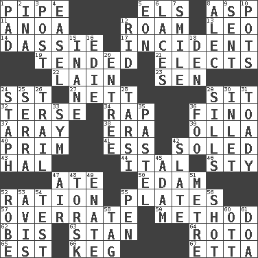 ACROSS 1. Corncob 5. Raised railways 8. Viper 11. Small Philippine buffalo 12. Wander aimlessly 13. Lion 14. Hyrax 17. Event 19. Watched over 21. Opts 22. (Had) reclined 23. Elected rep. 24. Fast jet (abbr.) 27. Remaining after all deductions 29. Be seated 32. Laconic 34. Reproach for some lapse or misdeed 36. A pale, very dry sherry 37. Like ___ of sunshine 38. Epoch 39. Rounded earthenware pot or jar 40. Demure 41. Double-curved letter 42. Having a sole or soles 43. Actor Linden 44. Slanted text style (abbr.) 46. Filthy place 47. Had dinner 50. Dutch treat 52. Food allowance for one day 55. Food holders 57. Make much ado about nothing 59. Mode 62. Again 63. Comedian Laurel of Laurel & Hardy 64. Printing process, for short 65. Eastern Standard Time (abbr.) 66. Barrel 67. Singer James DOWN 1. Groovy apt. 2. _ tizzy (2 wds.) 3. Mail 4. Artist's stand 5. Age 6. Shoestrings 7. Grin 8. Actor Baldwin 9. Posted 10. Plant holders 12. To free from 15. Empty; void 16. Singer Brickell 18. Lair 20. Main course 24. Staphylococcus 25. Spanish missionary in California 26. Drop behind 28. Tarsus (plural) 29. Beverly of Met fame 30. An arm off of a larger body of water 31. Sycophant 33. Symbol (abbr.) 35. Soft color 36. Egg _ yung 42. Chalkboard 45. First man 47. Wind 48. Cod relative 49. Maternal 51. Distance measurement (Brit.) 52. Loose flowing garment 53. Deliberation 54. Trial 55. Fenced enclosure 56. Attempt 58. Label 60. Baseball player Mel 61. ___ good deed