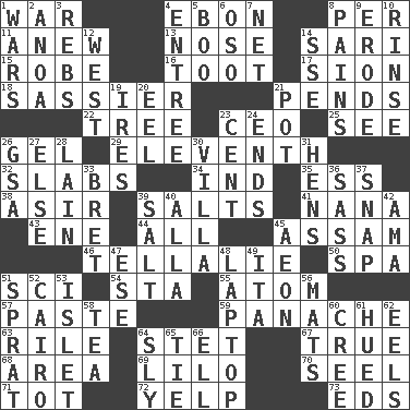 ACROSS 1. Armed conflict 4. Inky black, to poets 8. For each 11. Afresh 13. Olfactory organ 14. Indian skirt 15. Loose flowing garment 16. A blast of a horn 17. The Jewish people; Israel 18. More lively and spirited 21. Depends 22. Family _ (genealogy) 23. Corporate head (abbr.) 25. Perceive with the eye 26. Set 29. Veterans Day date 32. Broad, flat, thick pieces 34. Indiana (abbr.) 35. Double-curved letter 38. SW Saudi Arabia district 39. Table seasonings 41. Grandmother 43. Compass dir. 44. Everything 45. Indian state 46. Copy Pinocchio 50. Health resort 51. _-fi 54. R.R. building 55. Tiny particle 57. Thick mixture 59. Flamboyance 63. Cause heat under the collar 64. Proofreading order 67. Loyal 68. Length times width 69. _ and Stitch 70. Stitch closed the eyes of (a falcon) 71. Small child 72. Sharp bark 73. Begley and Asner DOWN 1. Armed conflicts 2. Small Philippine buffalo 3. Confederate soldiers (slang) 4. Main course 5. Sometimes accompanies a hiss 6. Bear (Spanish) 7. Fish or hair follower 8. Aches 9. Wear away 10. Wash lightly 12. Compass direction 14. Compass dir. 19. Angers 20. Snakelike fish 21. Plant holder 23. Penny 24. Extremities 26. Girls' org. (abbr.) 27. Otherwise 28. (Had) reclined 30. Country residence 31. Coop moms 33. Cy Young winner Saberhagen 36. Backtalk 37. Fastener 39. Table seasoning 40. Silent film actress Nazimova 42. Nursemaid (var.) 45. Age 47. Compass dir. 48. Portable computer 49. Call ___ day 51. Small fatty European fish 52. Capital of Egypt 53. Small island 56. Floor coverings 58. Afternoon social gathering 60. Algonquian 61. Became colored 62. Snakelike fish 64. Cunning 65. Make a knot 66. Pipe bend