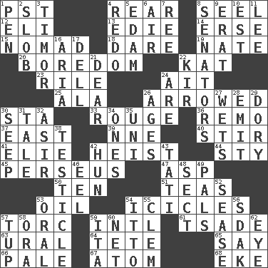ACROSS 1. Pacific Standard Time (abbr.) 4. Buttocks 8. Sew up the eyelids of hawks and falcons 12. Connecticut Ivy Leaguer 13. Singer Brickell 14. Celtic language 15. Roamer 18. Have the gumption 19. Nathan's nickname 20. Mood resulting from idleness 22. Krazy ___ of comics 23. Cause heat under the collar 24. Small island 25. Insect wing 26. Moved like an arrow 30. R.R. building 33. Makeup applied to the cheeks 36. San ____ (Riviera town) 37. 90 degrees 39. Compass dir. 40. Use a swizzle stick 41. Writer Wiesel 42. Robbery 44. Filthy place 45. Son of Zeus who helped slay Medusa 47. Cleo's killer 50. "___ Little Indians" 51. Beverages made from leaves 53. Lubricate 54. Winter's stalactites 57. Torque (variant) 59. International (abbr.) 61. Sadhe (variant) 63. Mountain range 64. False hair 65. Declare 66. Light colored 67. Tiny particle 68. Make supply last DOWN 1. Writing instrument 2. Messy guy 3. The easternmost of the Lesser Sundas 4. Redecorate 5. Dutch treat 6. Atmosphere 7. To separate or throw off 8. Legislators 9. Part of Q.E.F. 10. Eastern Standard Time (abbr.) 11. Area sheltered from the wind 16. Roberta Peters solo 17. Small valley 21. Letter starter 22. Apertif with cassis 24. "We ___ not amused" (Victoria) 26. Matures 27. Soaks 28. Give off 29. Dinghy 30. Ooze 31. Lie 32. SW Saudi Arabia district 34. Singles 35. Single; one (prefix) 38. One of the two male reproductive glands 42. Attila the _ 43. Jacques of French films 46. Snakelike fish 48. Religious group 49. Friends 52. Gospel singer Marvin 53. Spoken 54. "Tell ____ the Marines!" 55. Clement's nick name 56. Neighbor of Neb. 57. Uncastrated adult male sheep 58. Mouth or opening 59. Call ___ day 60. Fish or hair follower 62. Sight organ