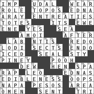 ACROSS 1. Naughty child 4. Allodial 8. Erode 12. Hero or heavy, e.g. 14. Traditional theme or motif 16. Pulitzer Prize-winning author Ferber 17. Like ___ of sunshine 18. Pleas 20. Hauls 22. ___ a Wonderful Life 23. She-sheep 24. Compass dir. 25. It is so 28. Ocean 30. Mine, in Marseilles 31. Following 35. Experiment locale 37. Nuclear Threat Initiatives 40. Redecorate 41. Farming town in central California 42. Religious groups 44. Inside; within (prefix) 45. On the rocks 46. Lick closed 47. Filthy place 48. Abounding in pines 50. "Silly old bear" 52. Morning condensation 54. Layer 55. Health resort 58. Reproach for some lapse or misdeed 61. Lion 63. Ferber et al. 65. The property of being fit to eat 70. I made a mistake 71. California wine valley 72. Mexican monetary units 73. Length times width 74. Sign of something about to happen 75. Posted 76. Three (prefix) DOWN 1. Feeling or showing extreme anger 2. Person of subnormal intelligence 3. Food holder 4. Shoshoni 5. Spanish title 6. Fitting 7. Australian parrot (variant) 8. Dripping 9. Singer Brickell 10. Afresh 11. To erase 13. Sight organ 15. Puts into a specified state 19. At sea 21. Symbol (abbr.) 26. Immeasurably long periods of time 27. Locates 29. Anew 30. Remained 32. Portable shelter 33. Whirlpool 34. Friend of Pooh 35. Venues 36. Arabian gulf 38. Frozen water 39. Staphylococcus 41. Mouth edge 43. _ gin 49. Shout 51. Single 53. Shed a tear 55. Derisive sound 56. Some stationery 57. Slender Brazilian palm 58. Former U.S. Attorney General Janet 59. First of billions? 60. Corncob 62. Singles 64. ___ good deed 66. Bar 67. Compass dir. 68. Male child 69. Fast jet (abbr.)