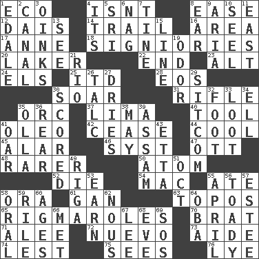 ACROSS 1. Environmental prefix 4. Is not 8. Relaxation 12. Raised platform 14. Lag or linger behind 16. Length times width 17. Queen of England 1702-14 18. Seigniories (variant) 20. Member of a famous L.A. basketball team 22. Conclude 23. The first octave above the treble staff 24. Raised railways 25. It would 28. Greek goddess of the dawn 30. Fly high 31. Ransack; plunder; pillage 35. The grampus (Milton) 37. Pale green bean 40. Implement 41. Margarine 42. Desist 44. Calm and collected 45. Having or resembling wings 46. System (abbr.) 47. Baseball player Mel 48. More valued for its uncommonness 50. Smallest unit of an element 52. Pass on 54. Big _ 55. Had dinner 58. Mouth or opening 61. Separate the seeds from cotton 63. Traditional theme or motif 65. Frustrating wastes of time 70. Naughty child 71. Toward shelter 72. New (sp.) 73. Helper 74. For fear that 75. Observes 76. Potassium hydroxide DOWN 1. Peak District village in England 2. Lessep's creation 3. Pig sounds 4. ___ a Wonderful Life 5. Indian title of respect (Mr.) 6. Tired old horse 7. Prong on a fork 8. Ewer handle 9. Operatic vocal solo 10. Stitch closed the eyes of (a falcon) 11. 90 degrees 13. Observe 15. Actor's bit 19. Aroma 21. _ de Janeiro 26. Baby powder 27. Frees from moisture 29. "Cheers" or "Ellen" 30. Tallied 32. One third of a yard 33. Plunder 34. Pipe bend 35. Water jar 36. Buttocks 38. Can I? 39. Indian state 41. Rowing implement 43. Singer James 49. Port city in Latvia 51. Sep. follower 53. Merit 55. Showery time 56. Sycophant 57. First name in cosmetics 58. Taken by mouth 59. Cause heat under the collar 60. Ripens 62. Common sense 64. Chief or king in Benin or Nigeria 66. Was introduced to 67. Area sheltered from the wind 68. First lady 69. Distress signal