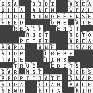 ACROSS 1. Girls' org. (abbr.) 4. "You Light Up My Life" star Conn 8. At sea 12. Rounded earthenware pot or jar 14. Arabian gulf 15. Welt 16. Farming town in central California 17. Unrelated to defense, as in spending 20. Nourish 21. Single 22. Had dinner 23. Arrive at 27. Send forth 29. Carrot, for example 31. Printing process, for short 34. _ dish (used to culture cells) 35. Length times width 36. Dad 39. A saturated hydrocarbon 41. Russian ruler of old 42. Constrict 43. Streamer paper 46. Falsehood 47. Airtight sealed metal containers 48. Loyal 51. Proofreads 54. Slender fish 56. Science/research agcy. 58. Moves up and down 61. Appease 66. Fastener 67. Portico 68. One who doesn't tell the truth 69. Light colored 70. Transmit 71. Singer James 72. To free from DOWN 1. _ course 2. _ gin 3. Tree or shrub in the Birch family 4. One of the 12 tribes of Israel 5. Wedding promise 6. Lair 7. _ china 8. Deep reverence 9. Elected representatives 10. Compass direction 11. Toward shelter 13. Helper 18. Compass dir. 19. Opposite of masc. 24. "We ___ not amused" (Victoria) 25. Small bed 26. Israeli folk dance 28. Feeling or showing extreme anger 30. A color or tint 32. Afternoon social gathering 33. Boat paddle 34. Some stationery 36. Pacific Standard Time (abbr.) 37. _ moment's notice (2 wds.) 38. Coward 40. 4th largest of the Great Lakes 44. Conclusion 45. 23rd letter of the Greek alphabet 49. Corn or form start 50. Eastern Standard Time (abbr.) 52. Cook's measure (abbr.) 53. Underwater navigation system 54. Global Positioning Systems (abbr.) 55. Johnson of "Laugh-In" 57. Do some clerical work 59. Indonesian resort city 60. Broke a traffic law 62. Groovy apt. 63. Small island 64. Make lace 65. Epoch