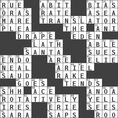 ACROSS 1. Regret 4. "This won't hurt ____!" 8. Prejudice 12. Mouths or openings 14. Assign a rank or rating to 15. At sea 16. Female horse 17. Interpreter 20. Entreaty 21. Definite Article 22. Cuckoo 23. Window treatment 27. Paradise 29. Thin strip of wood or metal 31. Competent 34. Before Barbara or Clara 35. Takes to court 36. Inside; within (prefix) 39. "We ___ not amused" (Victoria) 41. Writer Wiesel 42. Be tempered by heat 43. Satellite of Uranus 46. Saudi Arabian king (1953-1964) 47. Libertine 48. Travels 51. Watches over 54. Quiet! 56. Adept person 58. Small Philippine buffalo 61. Happening in regular succession 66. Shout 67. Angers 68. One of the Great Lakes 69. Observes 70. "Two Mules for Sister ____" 71. Plant excrements 72. Friend of Pooh DOWN 1. Play 2. Mountain range 3. Having ears or earlike features 4. Nonscientific branch of learning 5. Oblong piece of solid material 6. Call ___ day 7. Portable shelter 8. Sound made by sheep 9. Byzantium, centuries later 10. Age 11. Indian skirt 13. Burn superficially 18. A female animal or person 19. Directed 24. Insect wing 25. Baking dish 26. Singer James 28. Artist's stand 30. Ethiopian city, capital of Harari 32. Flowery wreath 33. Compass dir. 34. Twentieth part of a lira 36. Followers of ems 37. Teachers' org. 38. Female child 40. Part of Q.E.F. 44. Mamie's husband 45. Car or cant ending 49. Consume 50. _-fi 52. 24-hour periods 53. Scornful expression 54. Indian titles of respect 55. Israeli folk dance 57. Nights before holidays 59. Butter sub 60. In addition 62. White ___ sheet 63. Period 64. Mouth edge 65. Consenting reply