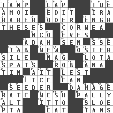 ACROSS 1. Pack (down) 5. Pet locale 8. Third day of the wk. 11. Mine, in Marseilles 12. Prepare for publication 14. Lyricist Gershwin 15. More uncommon 17. Baltic tributary 18. Engineer (abbr.) 19. College papers 21. Pupil covering 23. Non-commissioned officer (abbr.) 25. Nights before holidays 26. First of billions? 27. Elected rep. 28. Compass dir. 31. Bar bill 33. ___ Haven, CT 35. Flexible twig of a willow tree 37. Drop; flow; fall 38. Tired old horse 40. Globular water bottle used in Asia 41. Arguments over trivial matters 43. Director Reiner 45. Santa ___, CA 46. Metal container 47. Small island 50. For fear that 52. Louse (plural) 53. Avid follower 54. Sowing specialist 56. Break 61. Assign a rank or rating to 62. Soft 65. Chummy 66. The first octave above the treble staff 67. "Tell ____ the Marines!" 68. _ gin 69. Parent Teacher Assoc. 70. Erode 71. Scottish caps DOWN 1. Small pie 2. Nanny 3. Greater amount 4. Sliced desserts 5. Lion 6. Say or write further 7. Parts 8. Prong on a fork 9. Capital and largest city of Mongolia 10. Hearing organ 13. Collection of objects 16. Tear apart 18. Followers of ems 20. Examine minutely or intensely 22. Former U.S. Attorney General Janet 24. Presage 26. Collude with 28. The Jewish people; Israel 29. Bristle 30. Epoch 31. Native american tent (variation) 32. Actor Alda or Thicke 34. Armed conflict 36. Narrow board 37. Fast jet (abbr.) 39. Eighteen holes 42. Alleged 44. Necklace unit 48. Ancient Celtic tribe of eastern Britain 49. Cigar-shaped 51. Fastener 52. Area sheltered from the wind 54. Table seasoning 55. Singer James 57. Vertical spar for supporting sails 58. Silent film actress Nazimova 59. Take by theft 60. Snake ____ (dice throw) 61. Reproach for some lapse or misdeed 63. R.R. building 64. Being at a high temperature