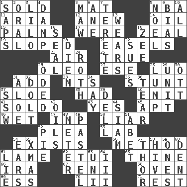 ACROSS 1. Exchanged or delivered for money 5. Floor protector 8. Basketball assoc. 11. Roberta Peters solo 12. Afresh 14. Lubricate 15. Insides of hands 17. Past tense of be (plural) 18. Ardor 19. Slanted 21. Artist's stands 23. Wind 25. Loyal 26. Butter sub 27. Compass dir. 28. Nilotic language 31. Find the sum of 33. Mountains (abbr.) 35. Difficult or unusual or dangerous feat 37. _ gin 38. Possessed 40. Send forth 41. Twentieth part of a lira 43. Consenting reply 45. Fitting 46. Soggy 47. Mischievous child 50. One who doesn't tell the truth 52. Entreaty 53. Experiment locale 54. Is extant 56. Mode 61. Unable to walk 62. Needle holder 65. One or ones belonging to thee 66. Lyricist Gershwin 67. Painter Guido (1575-1642) 68. Baking chamber 69. Curvy letter 70. Cards in a Roman deck? 71. Take ten DOWN 1. Plant excrements 2. Relating to the mouth 3. _ and Stitch 4. Moist 5. Opening into something insatiable 6. A saturated hydrocarbon 7. Cigar-shaped 8. Christmas carol 9. Prejudice 10. 100% 13. Puts on (as clothing) 16. Lick closed 18. Last letter of the English alphabet 20. South Vietnam president (1954) 22. Institutes legal proceedings 24. Writer of Portnoy's Complaint (1969) 26. Wrote a lyric poem 28. Mass 29. A single undivided whole 30. Baseball player Mel 31. _ vera 32. Stupid person 34. Declare 36. Pull apart 37. Compass dir. 39. Small valley 42. Lubricates 44. Thailand, formerly 48. Distance measurement 49. Soft color 51. Collude with 52. Sliced dessert 54. Hearing organs 55. Dec. holiday 57. Son of Odin 58. Hub of activity 59. Singles 60. Scratch 61. Falsehood 63. Single; one (prefix) 64. One more than two