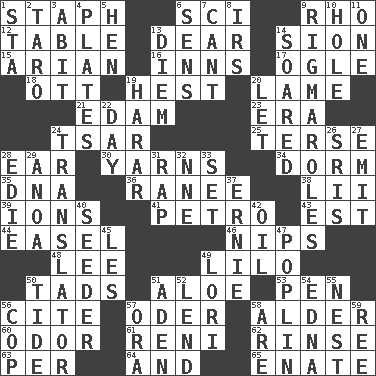 ACROSS 1. Staphylococcus 6. _-fi 9. 17th letter of the Greek alphabet 12. Eating place 13. Letter starter 14. The Jewish people; Israel 15. Believer in; advocate of (suffix) 16. Restaurants 17. Stare at amorously 18. Baseball player Mel 19. Command 20. Unable to walk 21. Dutch treat 23. Epoch 24. Russian ruler of old 25. Laconic 28. Ewer handle 30. Entertaining tales 34. Dormintory (informal) 35. Heredity factor (abbr.) 36. The wife of a rajah (variant) 38. Cards in a Roman deck? 39. Charged atoms 41. Stone: prefix 43. Eastern Standard Time (abbr.) 44. Artist's stand 46. Cuts off 48. Area sheltered from the wind 49. _ and Stitch 50. Small boys 51. Medicinal plant 53. Animal enclosure 56. Quote 57. Baltic tributary 58. Tree or shrub in the Birch family 60. Aroma 61. Painter Guido (1575-1642) 62. Wash lightly 63. For each 64. Added to 65. Maternal DOWN 1. R.R. building 2. Edible starchy tuberous root 3. "This won't hurt ____!" 4. Food holders 5. Layer 6. Elected reps. 7. Patter 8. Big collection agency 9. Frustrating wastes of time 10. Hollow 11. Single 13. South Vietnam president (1954) 14. Flew 19. Ethiopian city, capital of Harari 20. Allow 22. 24 hours 24. Interpreter 26. Indian titles of respect 27. Send forth 28. Singer Brickell 29. Small Philippine buffalo 31. Hit sharply and swiftly 32. Compass dir. 33. Arrange properly for use 37. Bert's buddy 40. Sowing specialist 42. Petroleum 45. French article 47. Cotton for raincoats, e.g. 49. Australian parrot (variant) 50. Periodic rise and fall of the sea level 51. Arabian gulf 52. Grant temporary use of 54. Pulitzer Prize-winning author Ferber 55. A home for chicks 56. Police officer (slang) 57. Mouth or opening 58. "We ___ not amused" (Victoria) 59. To riddle