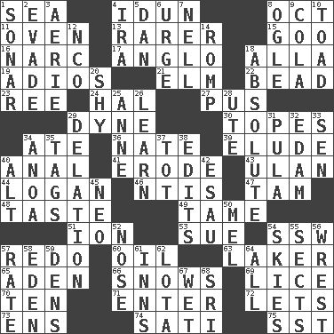 ACROSS 1. Ocean 4. Goddess of spring and wife of Bragi 8. Sep. follower 11. Baking chamber 13. More uncommon 15. Thick or sticky substance 16. Drug cop 17. White American of non-Hispanic descent 18. Silent film actress Nazimova 19. Goodbye (Sp.) 21. Shade tree 22. Necklace unit 23. To riddle 24. Actor Linden 27. Festering 29. Centimeter-gram-second unit of force 30. Drinks excessively 34. Had dinner 36. Nathan's nickname 39. Dodge 40. Of or related to the anus 41. Wear away 43. ____ Bator 44. Utah city north of Ogden 46. Nuclear Threat Initiatives 47. Scottish cap 48. Clothes sense 49. Docile 51. Electrically charged atom 53. Take to court 54. Compass dir. 57. Make new 60. Lubricate 63. Member of a famous L.A. basketball team 65. An important port of Yemen 66. Overwhelms 69. Louse (plural) 70. Nine, plus one 71. Keyboard key 72. Allows 73. Followers of ems 74. Suttee (variant) 75. Fast jet (abbr.) DOWN 1. Underwater navigation system 2. Dodge 3. Nest on high 4. Lyricist Gershwin 5. Daniel's nick name 6. Goad 7. 1994 drama film starring Jodie Foster 8. Stare 9. Root beer relative 10. Frog relative 12. Non-commissioned officer (abbr.) 14. Frolic 18. Utter; complete 20. Like a shrinking violet 25. Queen of England 1702-14 26. Memorize 28. Shoshoni 29. Accusation by an informer 31. Monetary unit of Botswana 32. Dutch treat 33. Elected rep. 34. Small Philippine buffalo 35. Labels 37. Small child 38. Proofreads 40. The first octave above the treble staff 42. Son of Isaac 45. Modern: prefix 50. Cartoonist voice _ Blanc 52. Olfactory organ 54. Atmospheres 55. Religious groups 56. Take or capture by force 57. Pace 58. Paradise 59. Lairs 61. Taverns 62. Globular water bottle used in Asia 64. 100% 67. Soggy 68. Indian title of respect (Mr.)