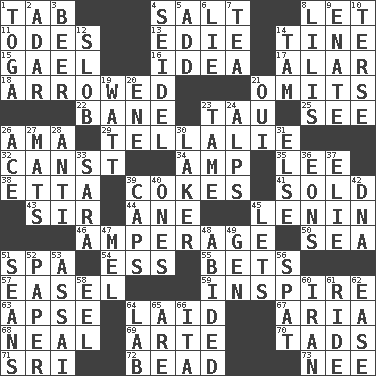 ACROSS 1. Keyboard key 4. Table seasoning 8. Allow 11. Lyric poems 13. Singer Brickell 14. Prong on a fork 15. Highlander 16. It may be bright or harebrained 17. Having or resembling wings 18. Moved like an arrow 21. Leaves out 22. Object of repulsion 23. The 19th letter of the Greek alphabet 25. Perceive with the eye 26. Nanny (var.) 29. Copy Pinocchio 32. 2nd pers. sing. pres. of can (arch.) 34. Electrical Unit 35. Area sheltered from the wind 38. Singer James 39. Popular sodas 41. Exchanged or delivered for money 43. Title for a knight 44. A saturated hydrocarbon 45. Soviet premier 1918-24 46. Electrical Measurement 50. Ocean 51. Health resort 54. Curvy letter 55. Stakes 57. Artist's stand 59. Stimulate to action 63. Domed church section 64. Put down 67. Operatic vocal solo 68. Actress Patricia 69. Johnson of "Laugh-In" 70. Bits 71. _ Lanka 72. Necklace unit 73. Born DOWN 1. Ancient Roman robe 2. The sixth month of the Jewish calendar 3. Fermented drink made from hops 4. A glass for beer 5. Say or write further 6. Untruth 7. Beverage made from leaves 8. Ms. Damita and namesakes 9. Related on the mother's side 10. Laconic 12. Messy guy 14. Scottish cap 19. Electrical Unit 20. Compass dir. 21. Fr. "Yes" 23. Docile 24. High mountains 26. Adept person 27. Floor protectors 28. Opposed to 30. Member of a famous L.A. basketball team 31. Otherwise 33. "Two Mules for Sister ____" 36. Immeasurably long periods of time 37. Writer Wiesel 39. Balmoral and tarboosh 40. Singles 42. Heredity factor (abbr.) 45. Allows 47. Cartoonist voice _ Blanc 48. Remained 49. Commissioned mil. rank 51. Seines 52. Some stationery 53. Slender Brazilian palm 56. Argument over a trivial matter 58. Snakelike fish 60. SW Asia republic 61. Travel on an animal 62. Relaxation 64. Experiment locale 65. "We ___ not amused" (Victoria) 66. Call ___ day